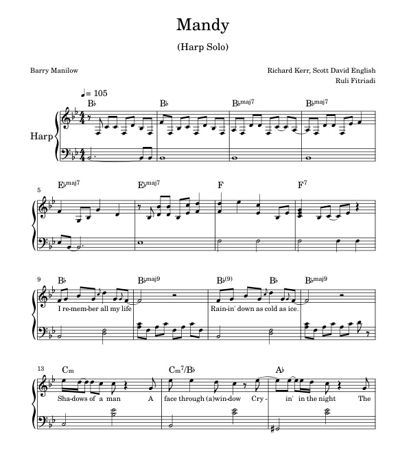 Barry Manilow - Mandy song easy listening and mellow gold, I made for the Instrumental Harp Solo ver. Chords Notes Sheet Music PDF + Audio Mp3