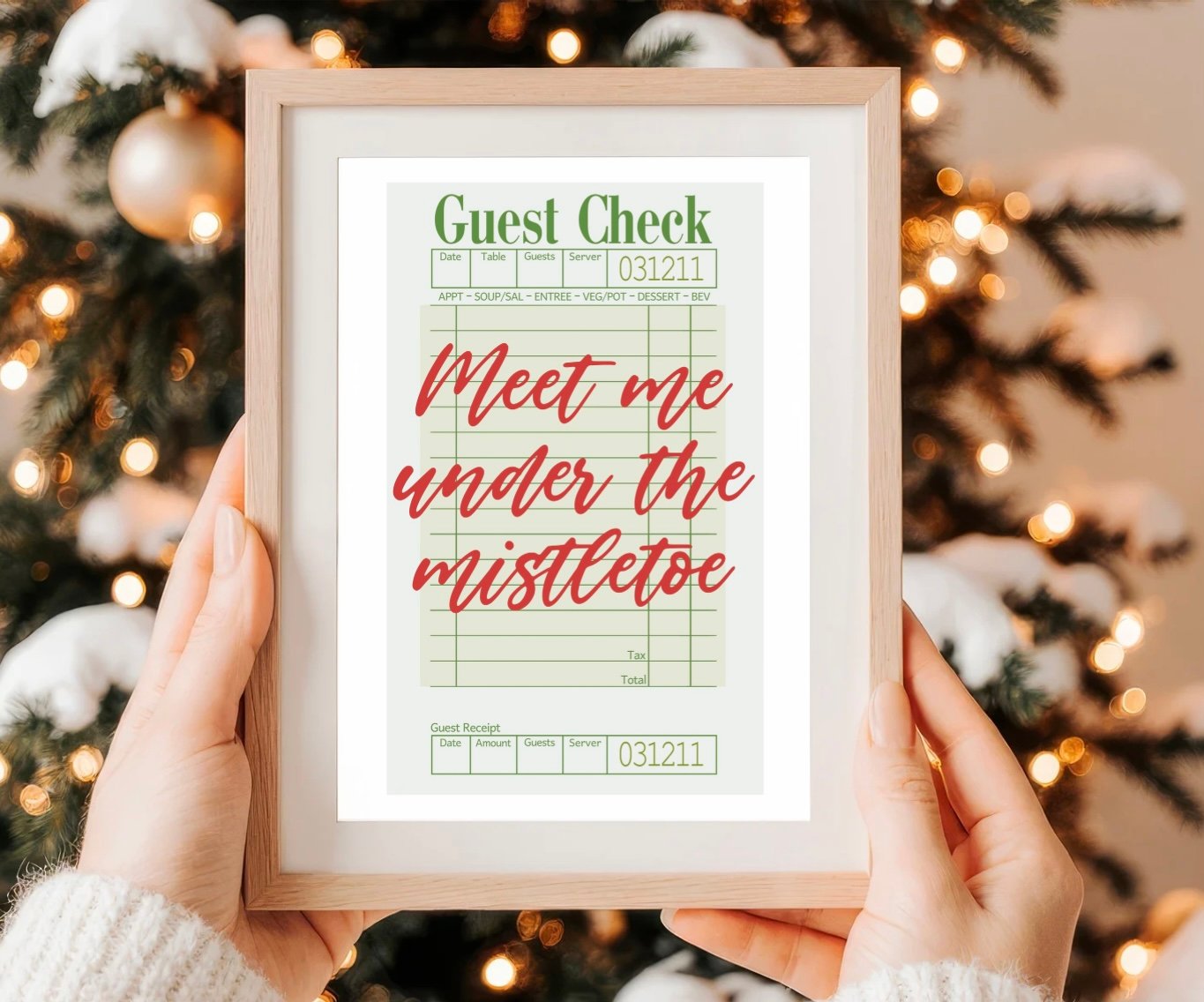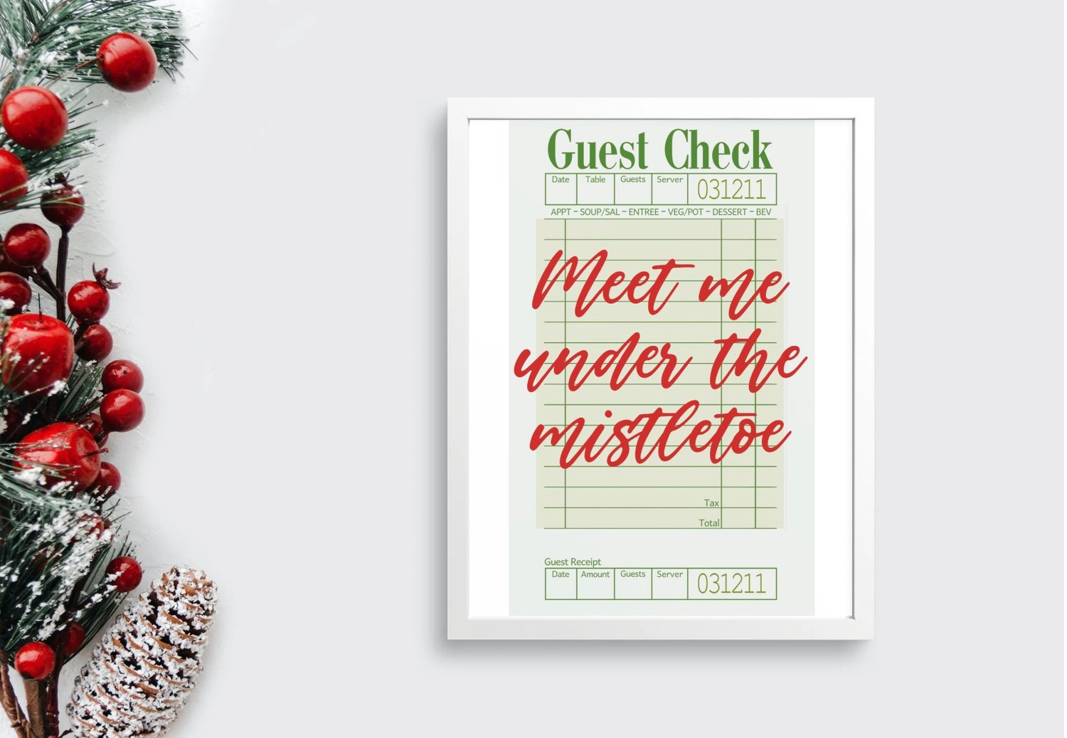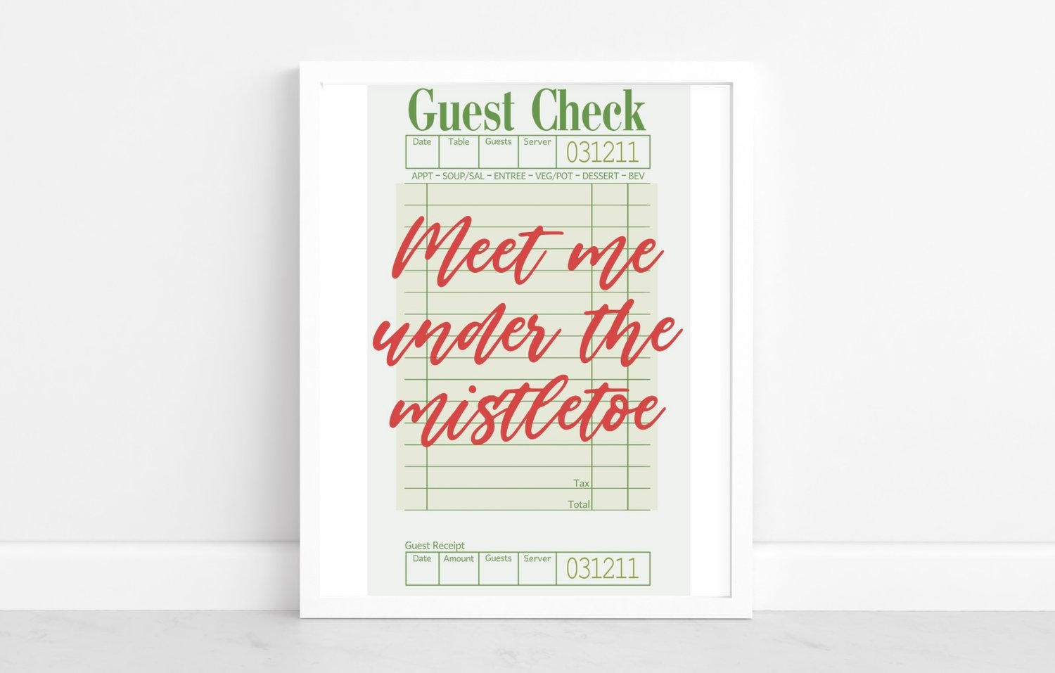 Add a touch of vintage Christmas charm to your holiday décor with this “Meet Me Under the Mistletoe” printable wall art! Styled like a classic restaurant guest check with festive red and green tones, this design brings cozy retro vibes perfect for kitchens, dining rooms, or holiday gatherings.