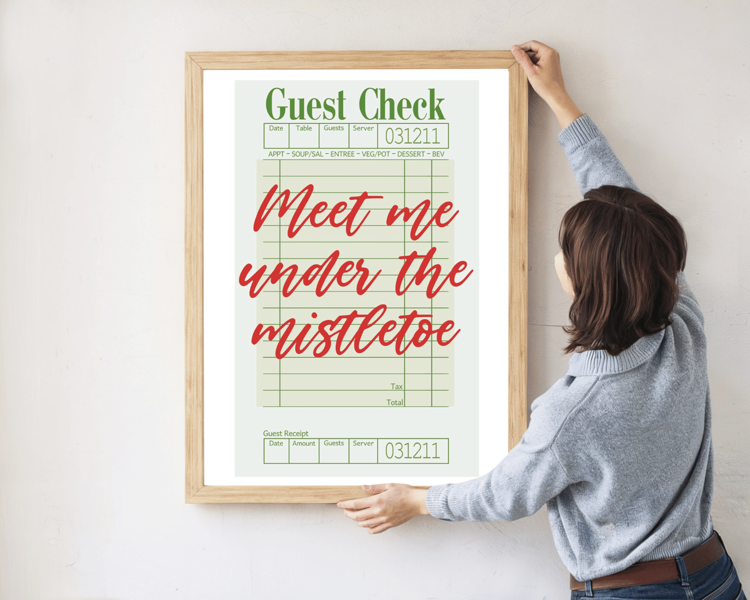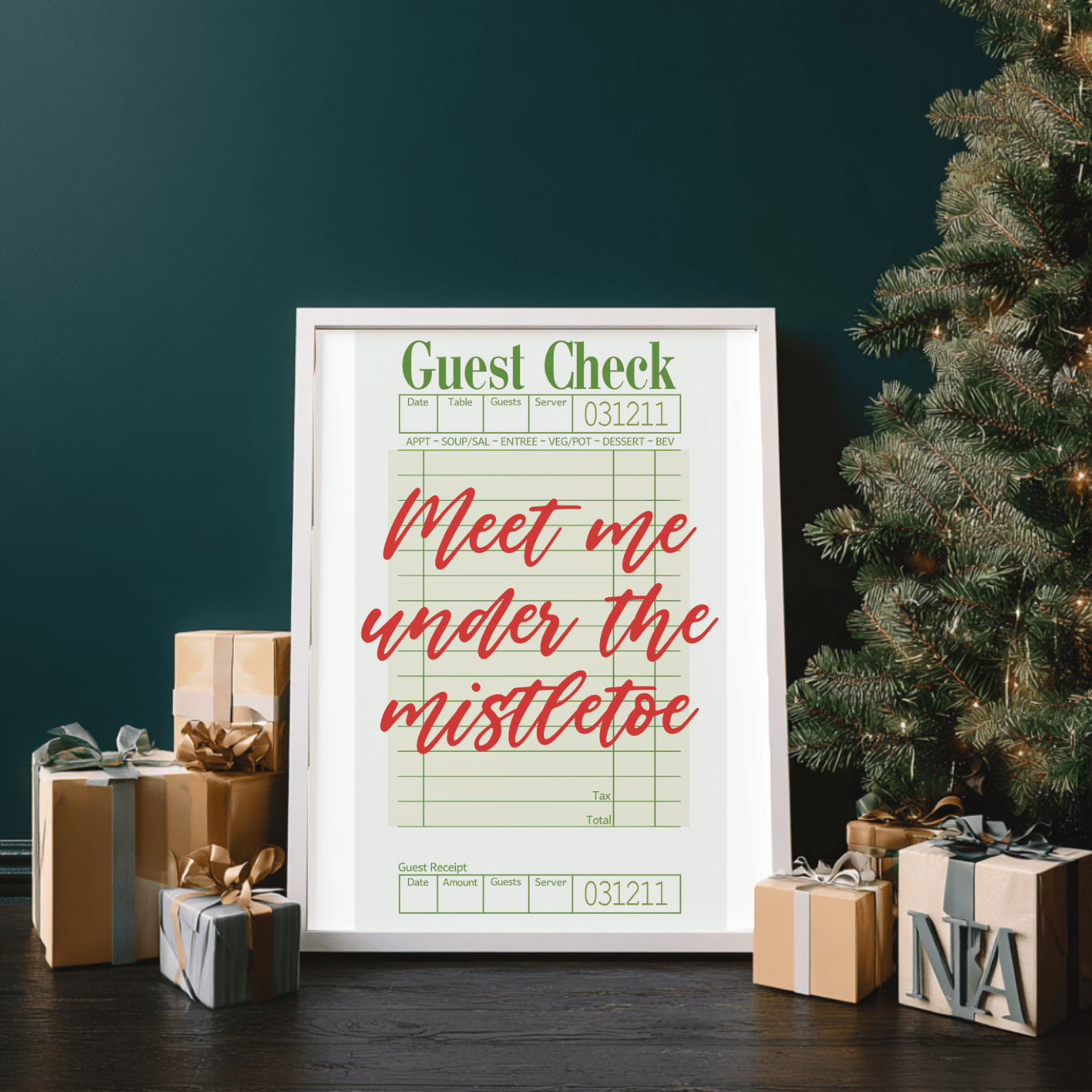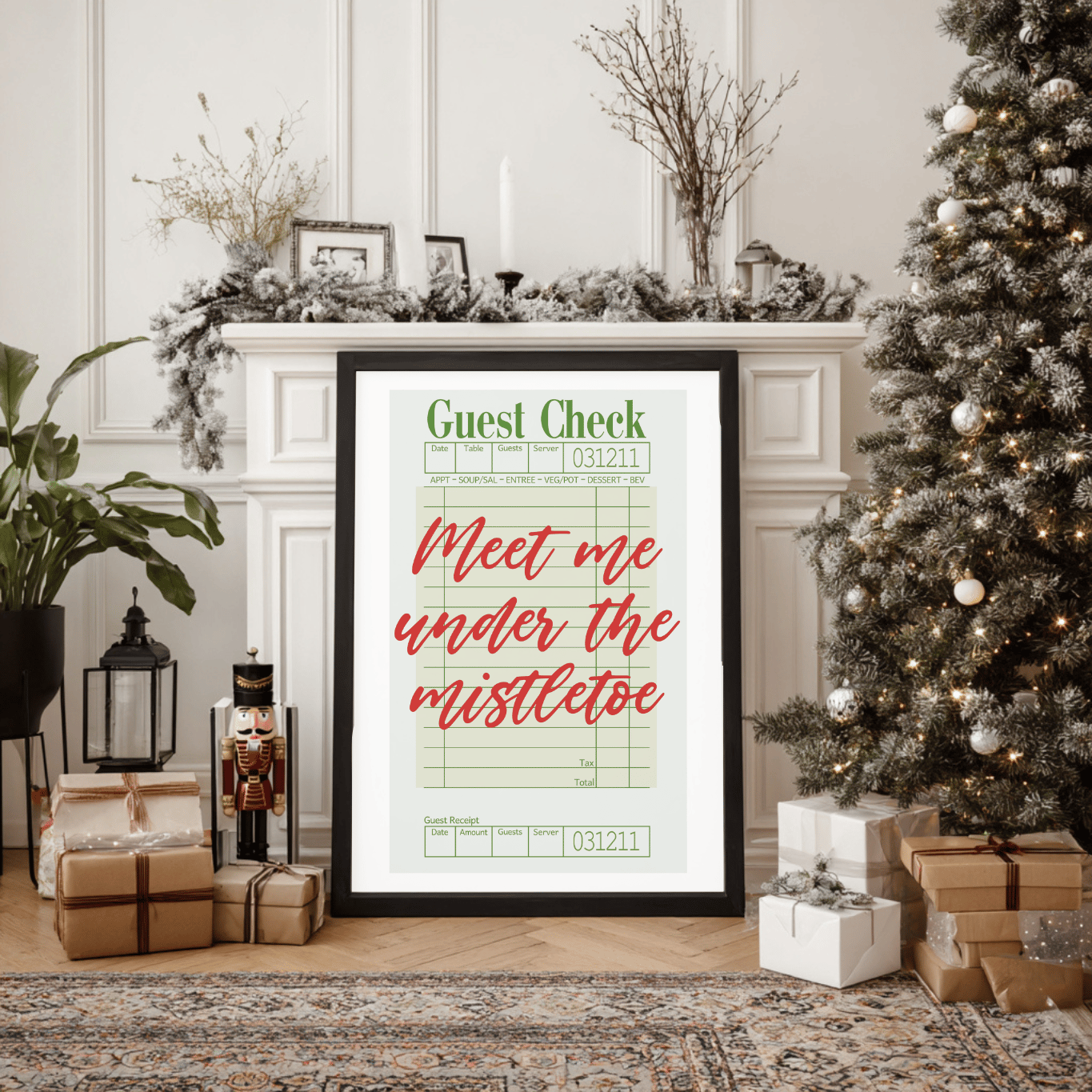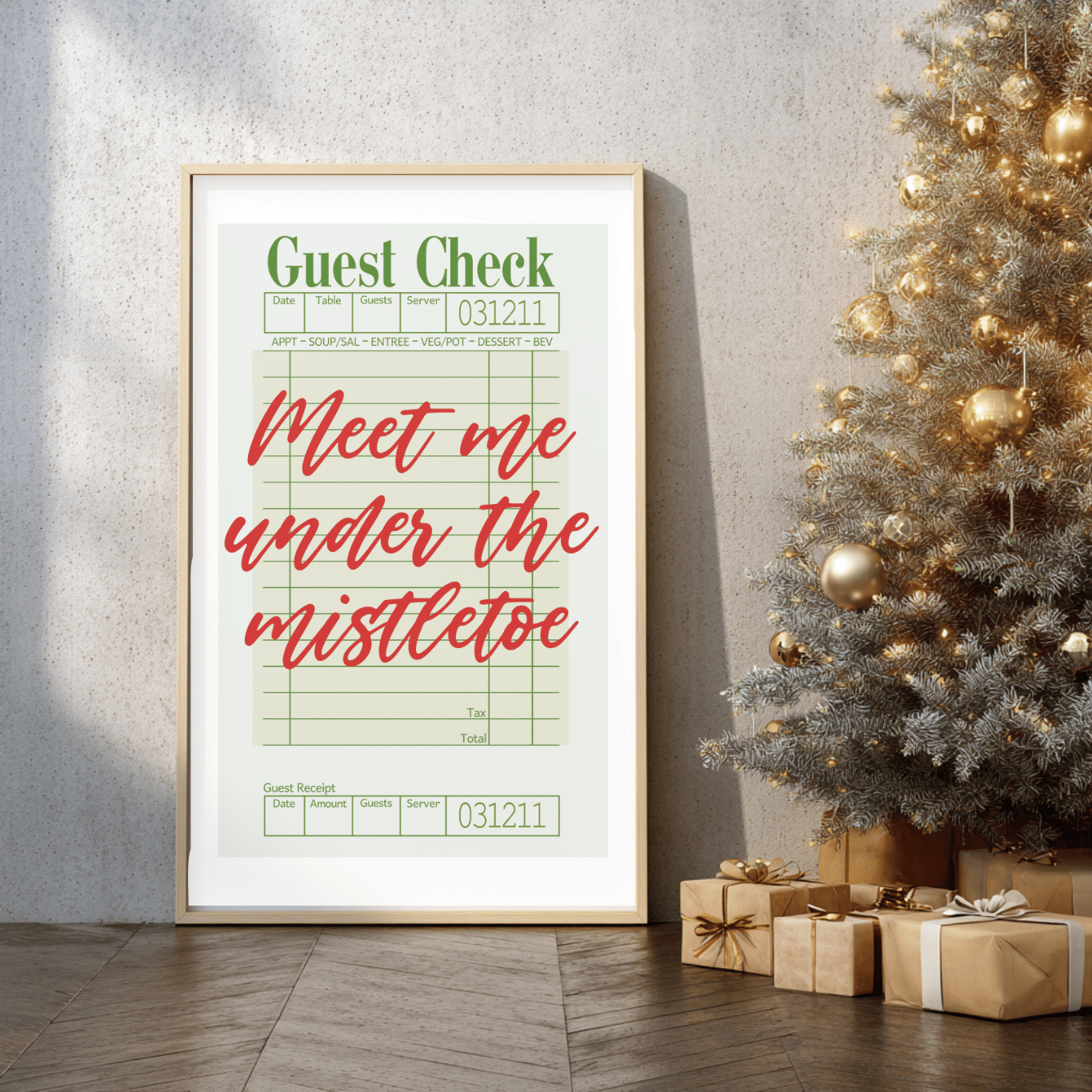 Add a touch of vintage Christmas charm to your holiday décor with this “Meet Me Under the Mistletoe” printable wall art! Styled like a classic restaurant guest check with festive red and green tones, this design brings cozy retro vibes perfect for kitchens, dining rooms, or holiday gatherings.