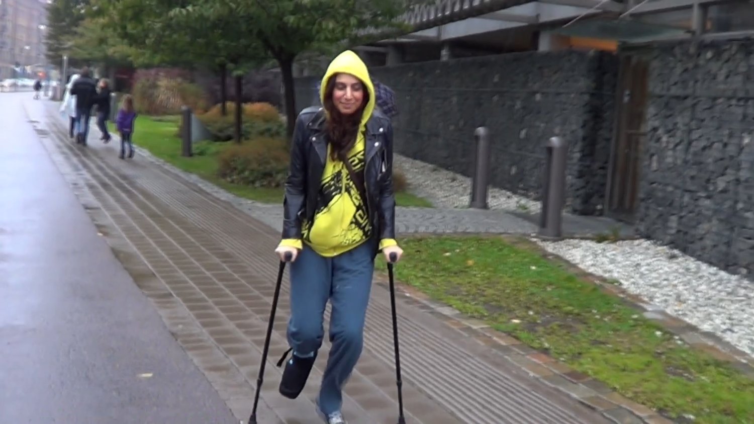 Penelope is crutching down some stairs with her medical short leg cast. Because it's a rainy day in Sweden has she cast shoe on her blue SLC to protect it and you can also see in this clip that she is trying to walk on her injured leg. I wonders what her doctor says about that?
