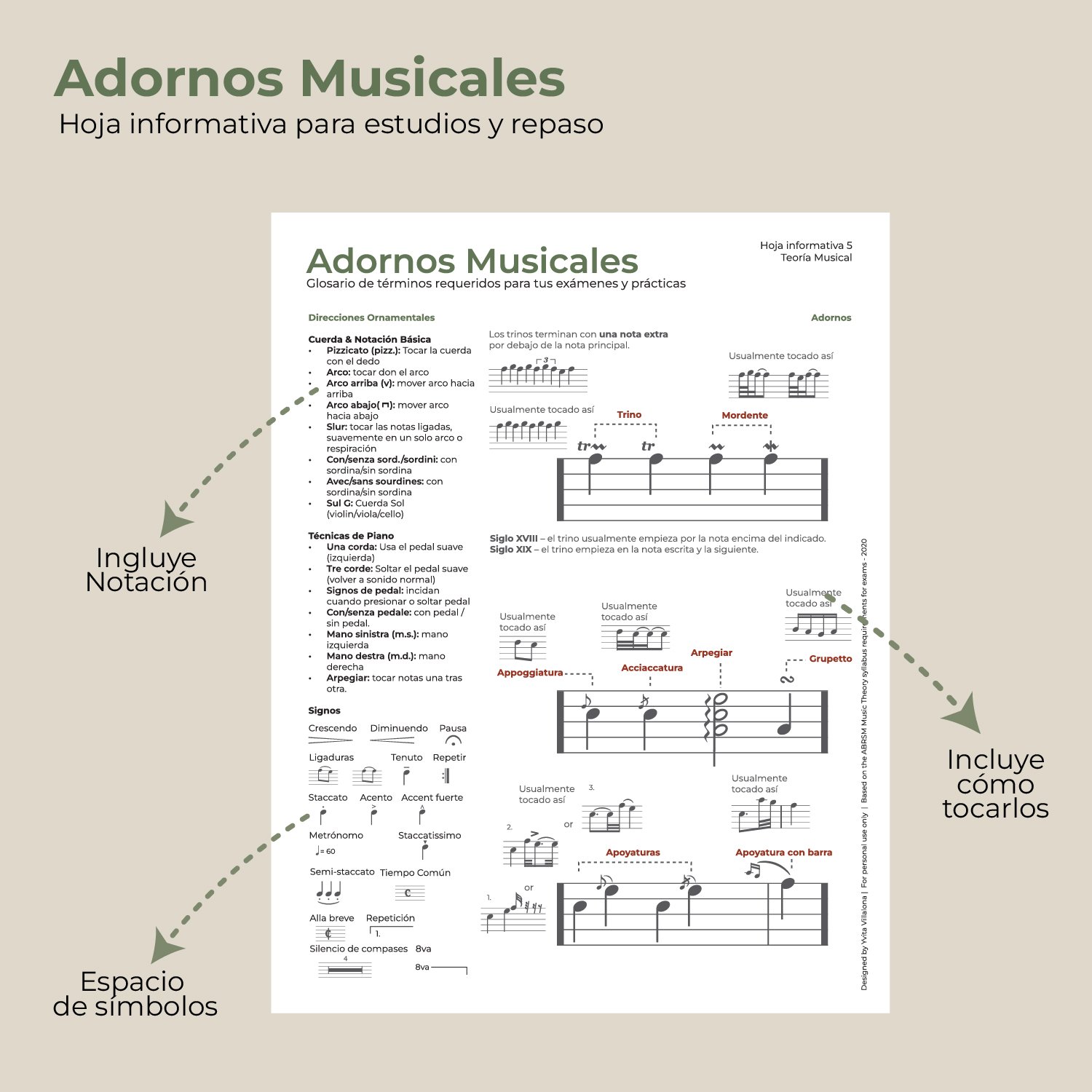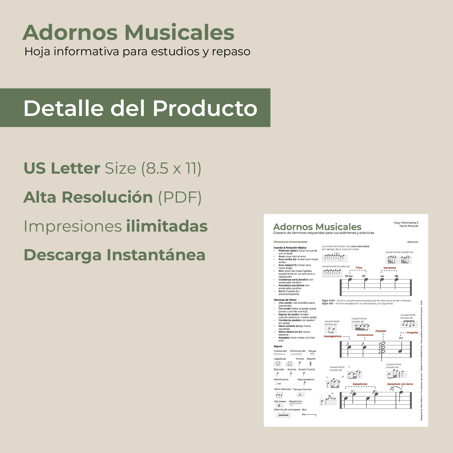 Guía de Adornos Musicales | Ornamentación Musical | Trinos, Mordentes, Grupetos y Notas de Adorno | Hoja Imprimible | Descarga Digital