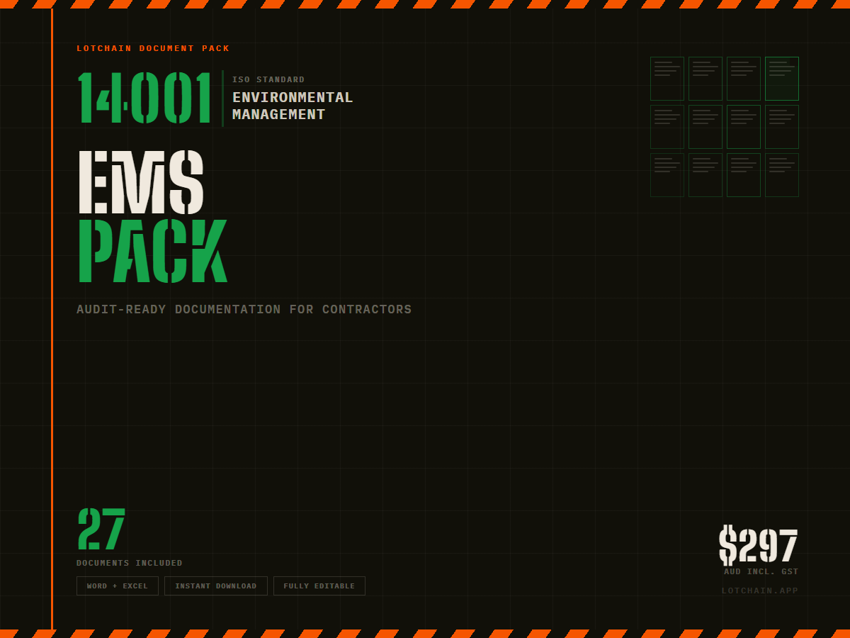 Pre-structured ISO 14001:2015 environmental management system for contractors. Includes environmental manual, policy, aspects register, incident log, compliance register, procedures, and clause reference matrix.