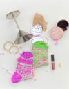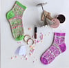 Sordid Affair Socks is a charted slip-stitch mosaic sock pattern consisting of a mirrored 16-stitch repeat. The pattern is written for toe-up socks using magic loop with an afterthought heel. Other heel styles can be substituted to create a sock with a flattering fit.