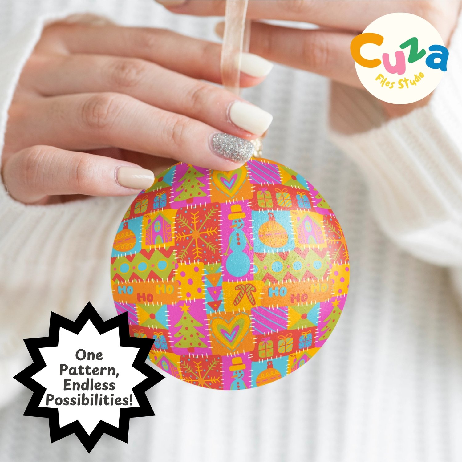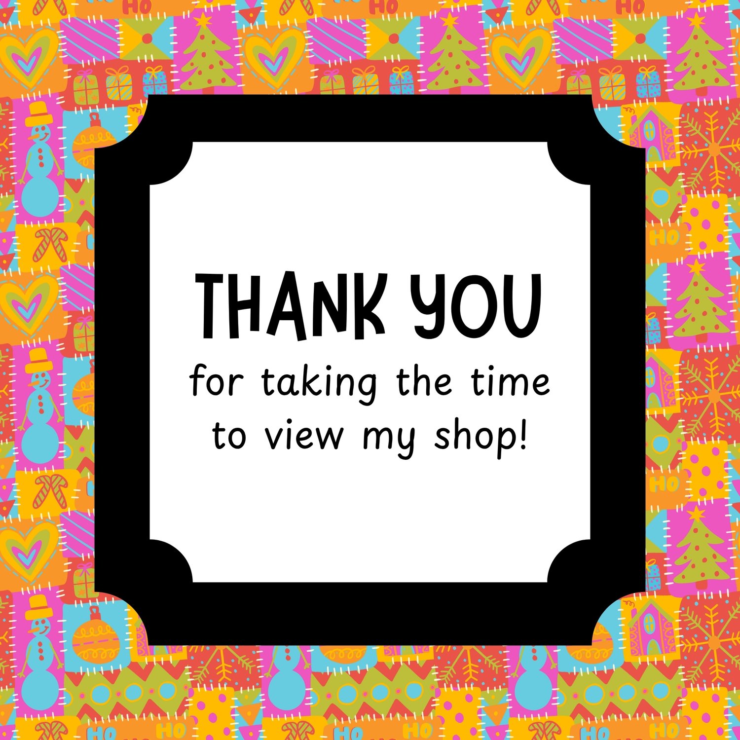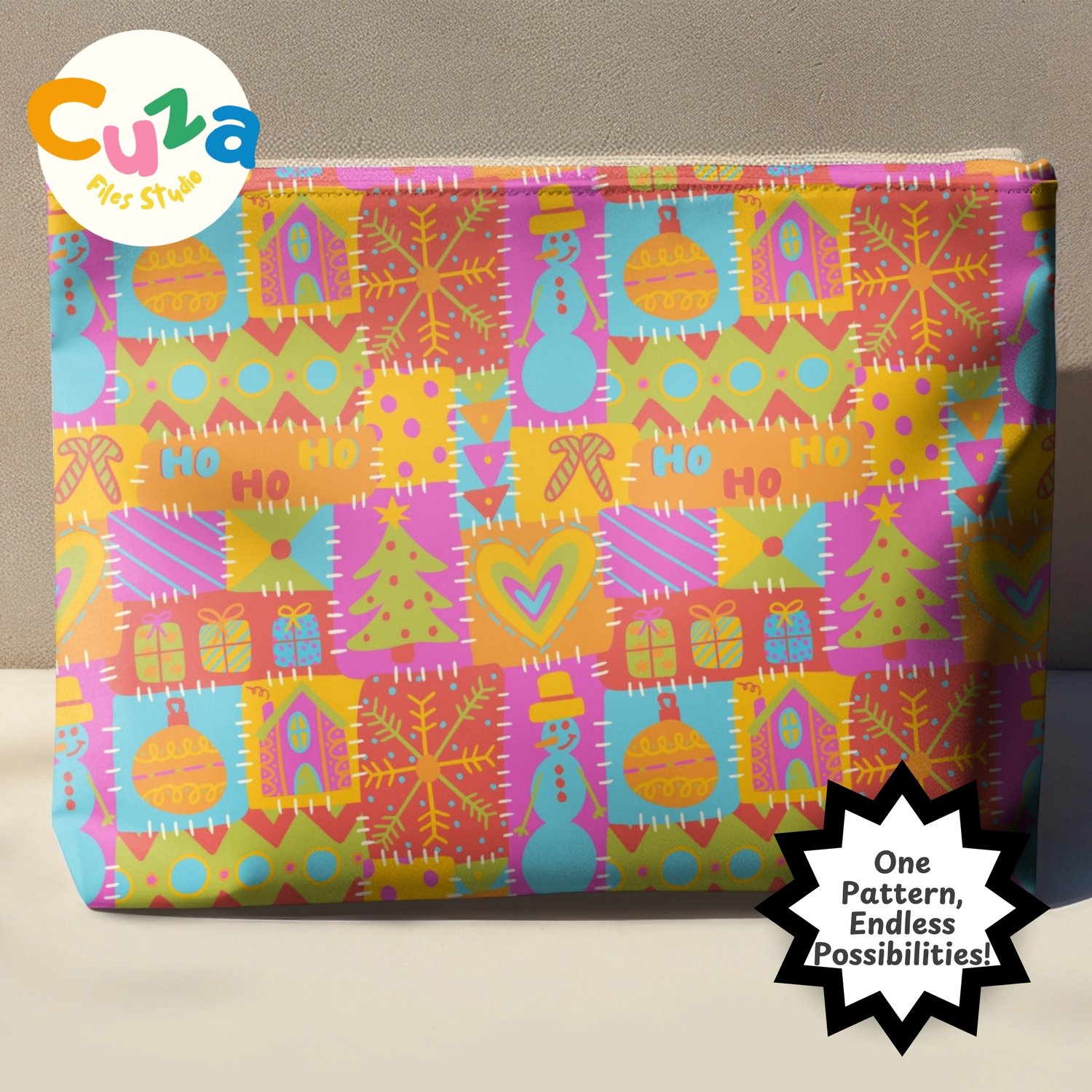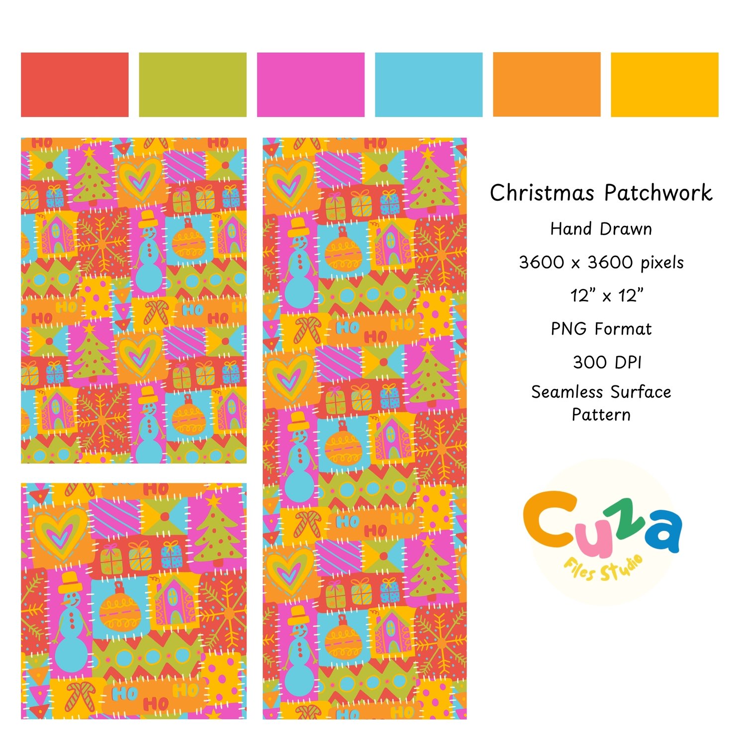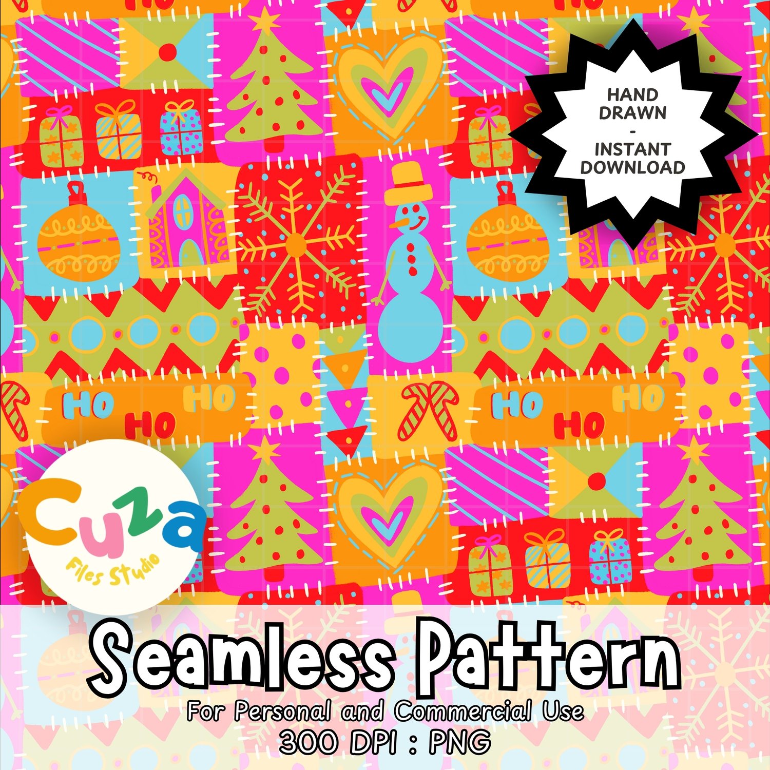 Make your Christmas crafts pop with this lively, hand-drawn patchwork pattern! It's got a fun, festive vibe with ornaments, Christmas trees, candy canes, gifts, snowflakes, and HO HO HO all stitched together in bright pink, orange, yellow, turquoise, and green. Think colorful quilt – perfect for the holidays!