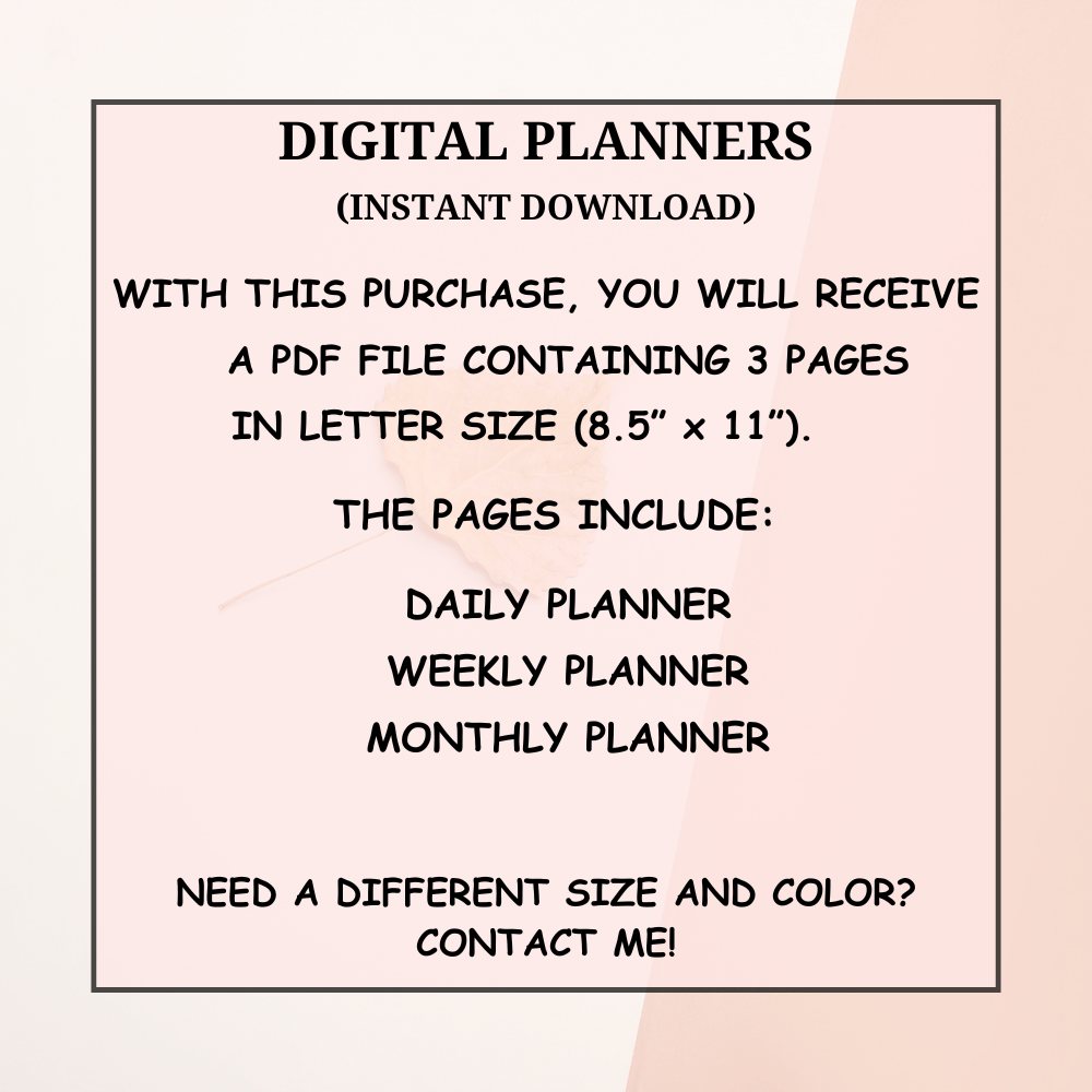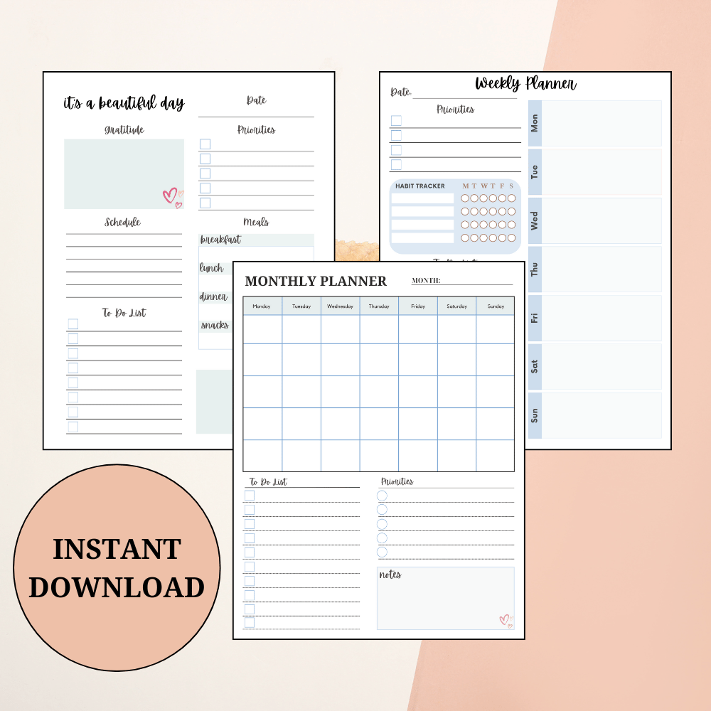 Daily, Weekly, Monthly Planner Set Printable, Undated Digital Planners, Productivity Organizer, Schedule, To-Do List, Meal Tracker, Habit Tracker, PDF Instant Download