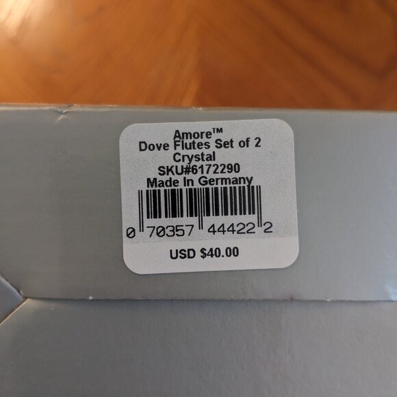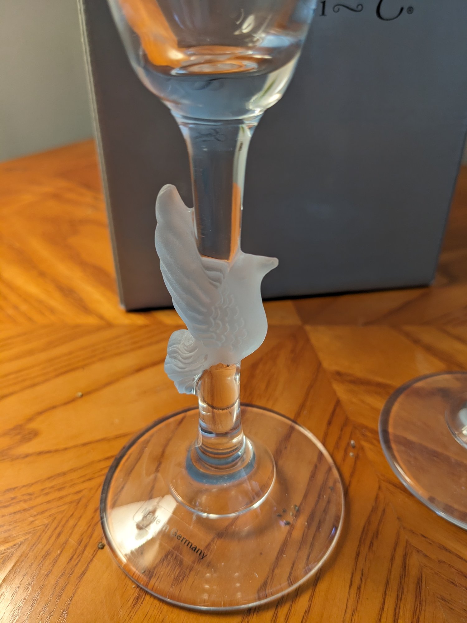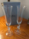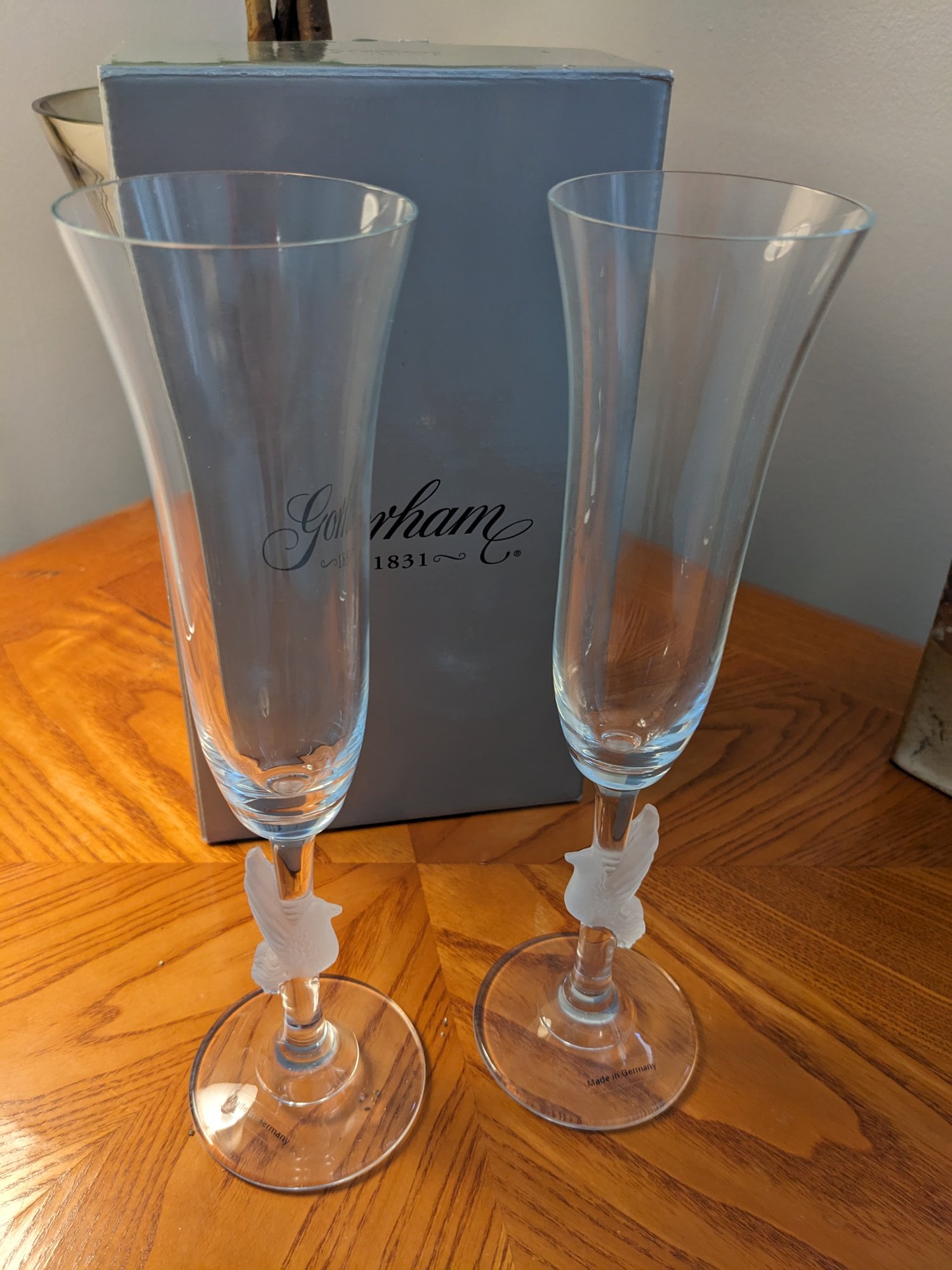 Beautiful set of Amoré Dove Toasting Champagne Flutes by Gorham Crystal. Made in Germany in 2000, unused and still in the original box. These would be perfect for your Wedding Day, New Year's Celebration or any special occasion. Or if you simply enjoy a nice glass of champagne or Prosecco with your friends, these glasses would add to the occasion.