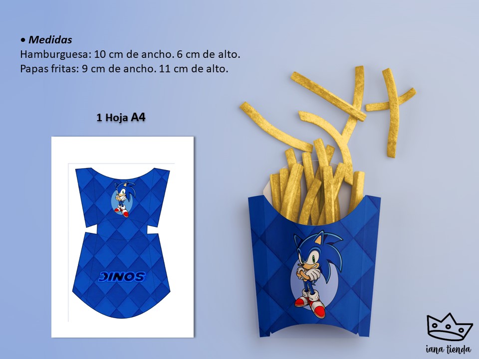 Esta plantilla incluye un adorable diseño de Sonic, ideal para armar una cajita temática de hamburguesa y papas fritas. Perfecta para fiestas, celebraciones infantiles o para darle un toque especial y divertido a tus comidas.