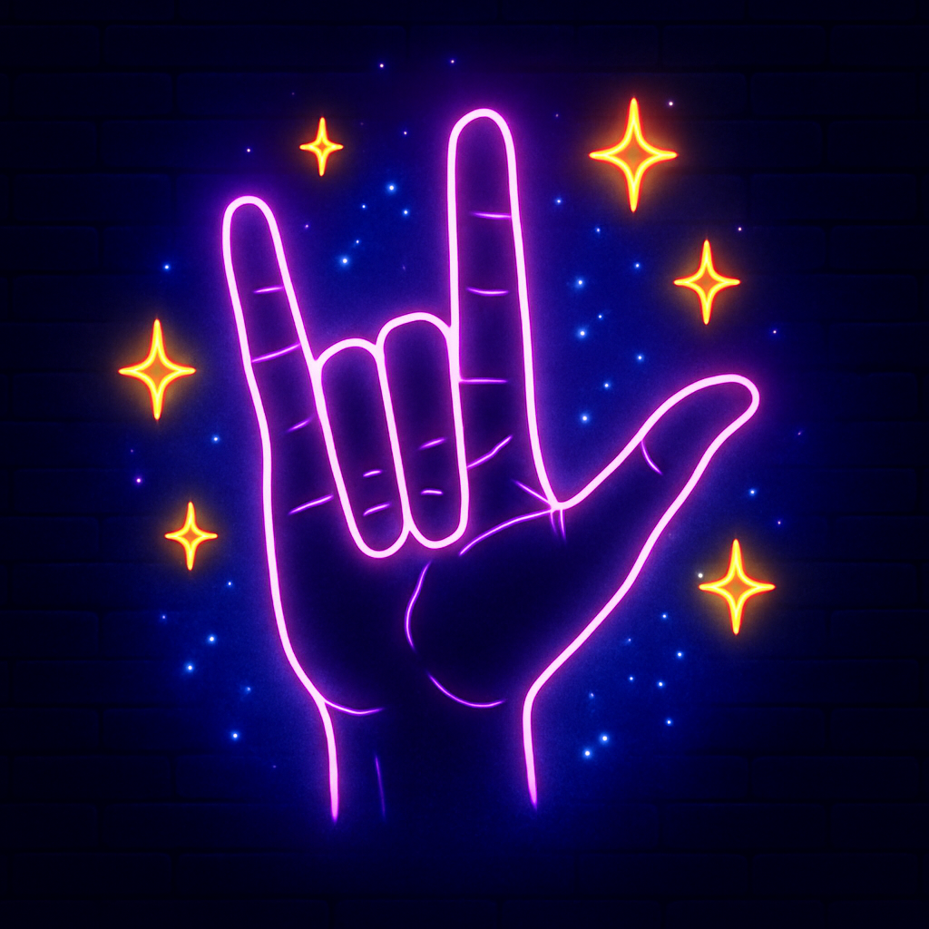 This standout neon design blends a glowing sketch-style ASL ILY handshape with a vibrant starry sky.