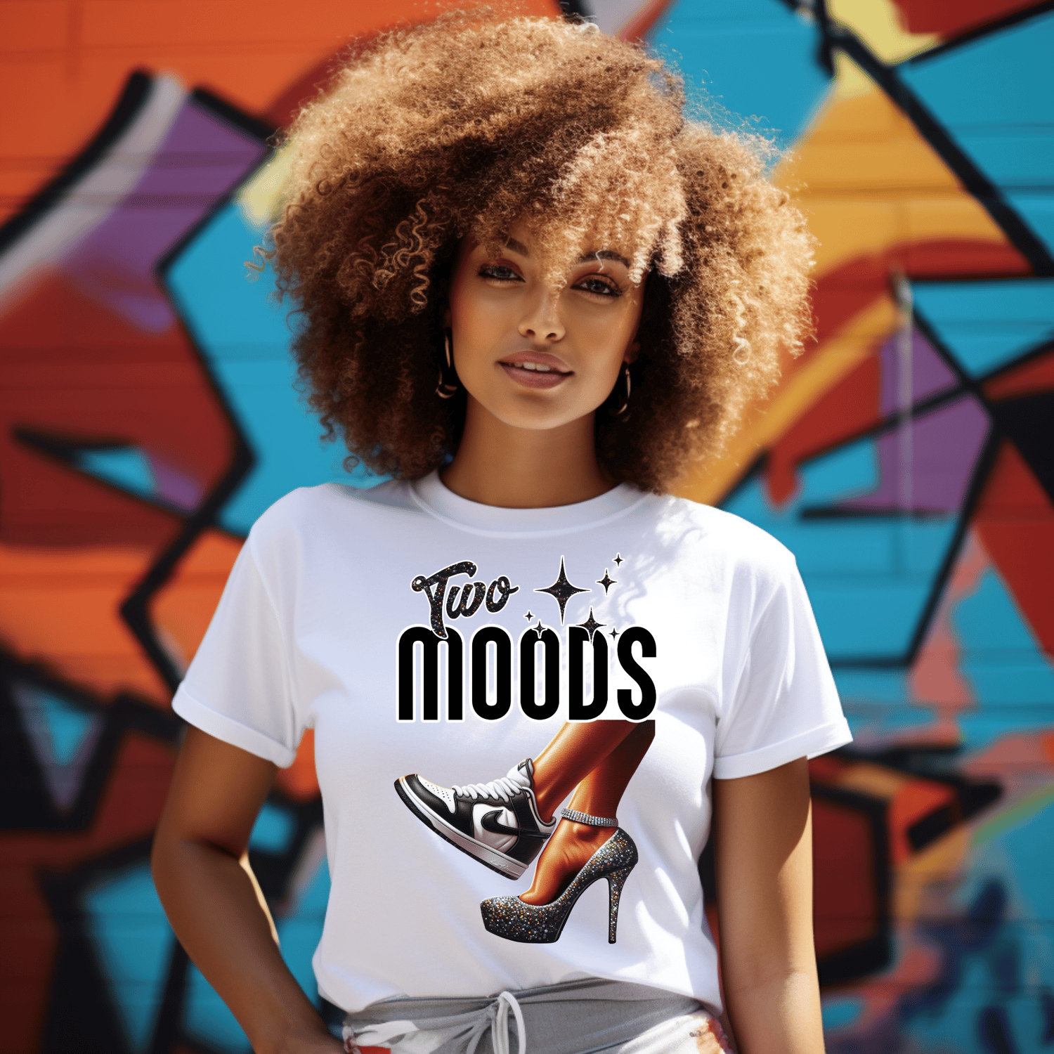 This “Two Moods” black and silver edition is for the queens who keep it classy and cool. Featuring a sparkling stiletto and bold black-and-white sneaker, this design is perfect for creating fashion-forward tees, hoodies.