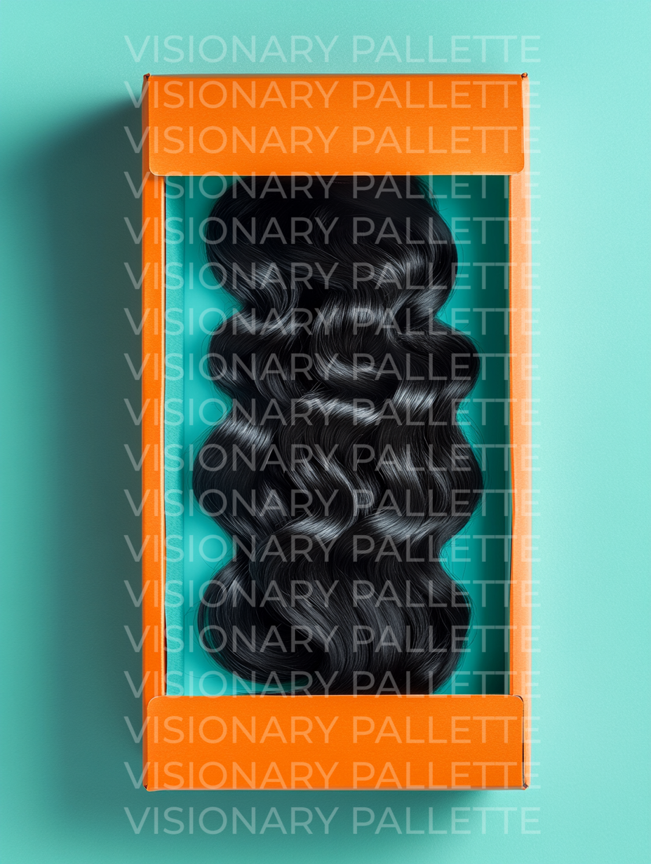 A realistic Teal and Orange Open subscription box with realistic black Wavy hair bundles inside
