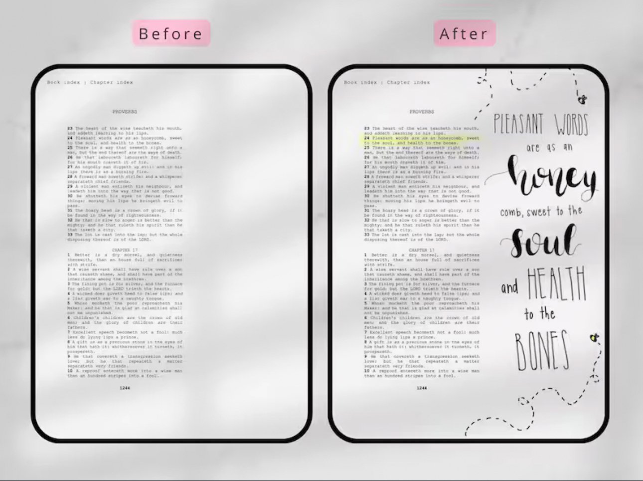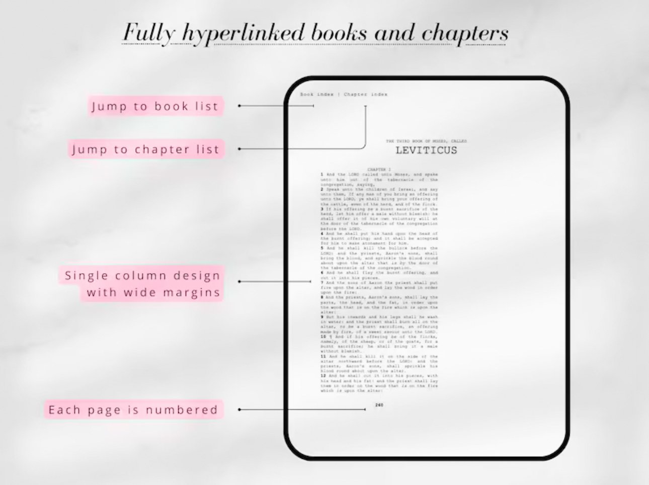 Our minimalistic large margin design allows you to highlight your favorite verses, add handwritten notes, drawings, calligraphy, images, stickers and collages around the biblical text.