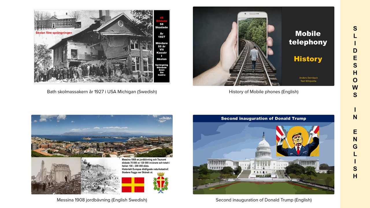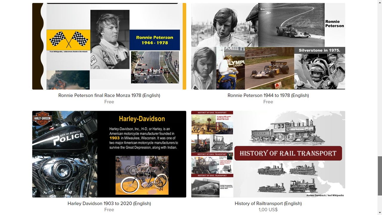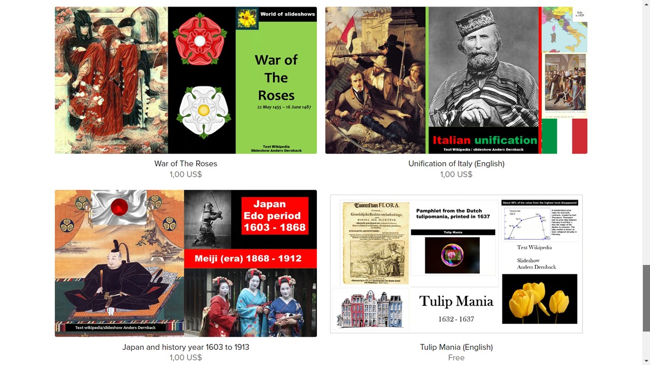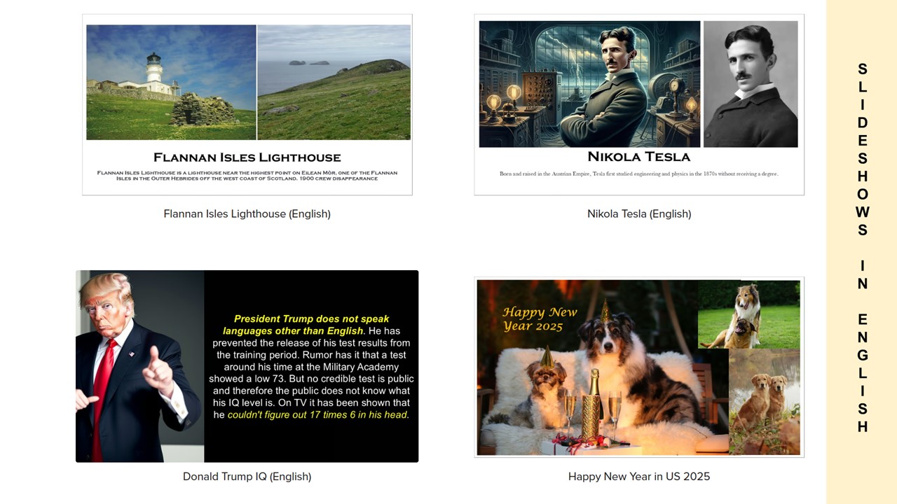 Welcome to download slideshows and audiobooks from my database. The design of the slide games is such that they are similar to picture books and for self-study. Text and image in combination teach more effectively than text alone.