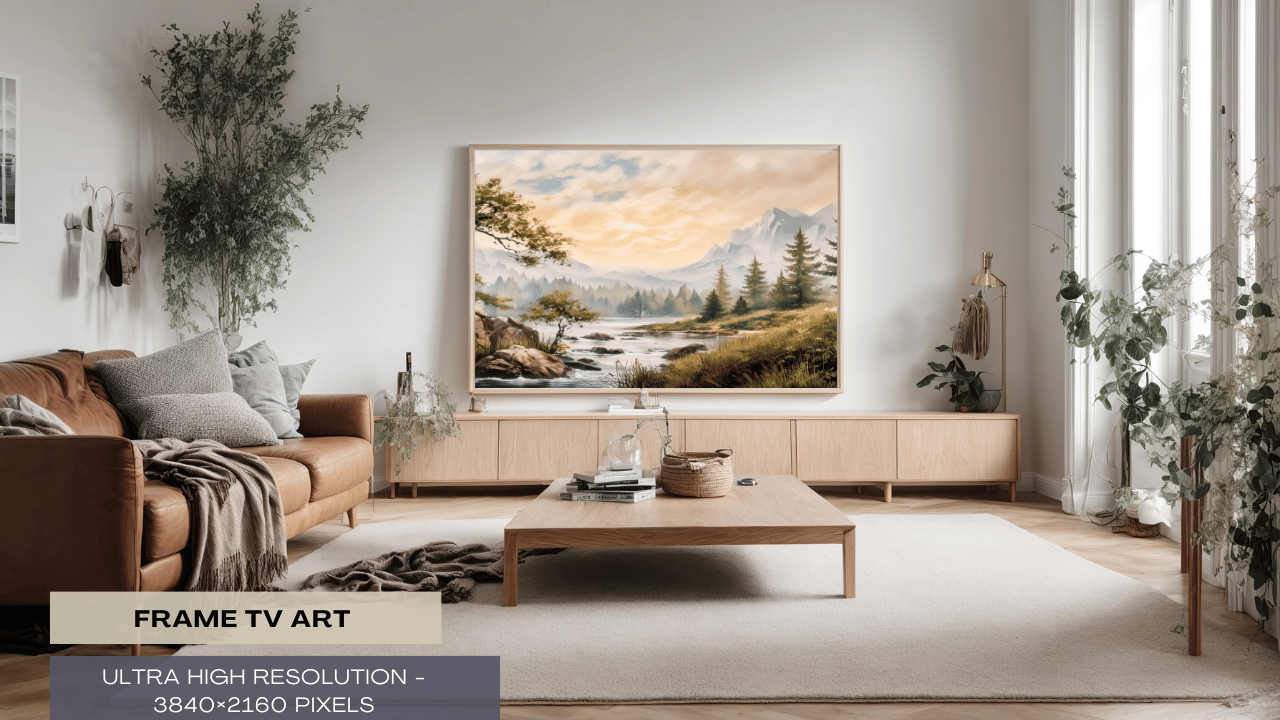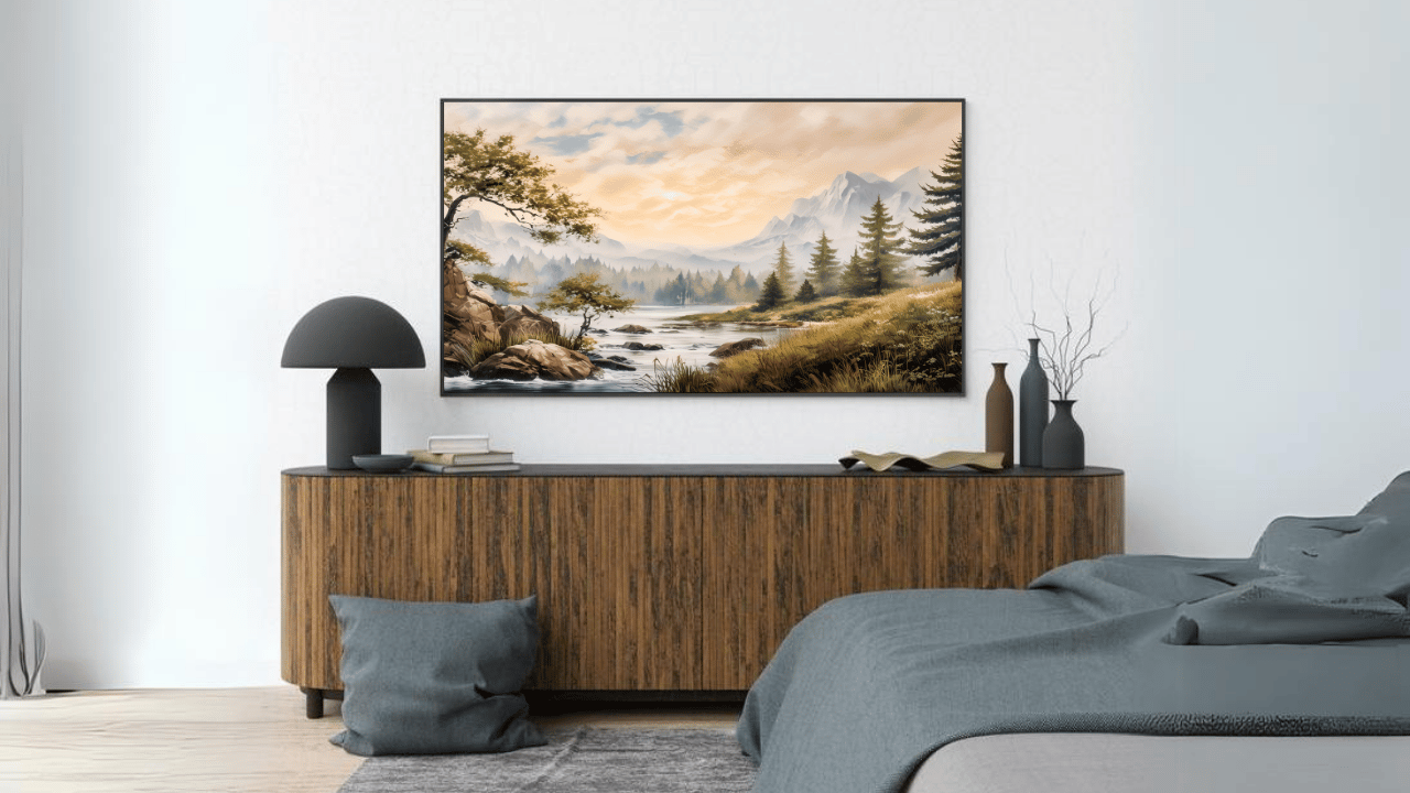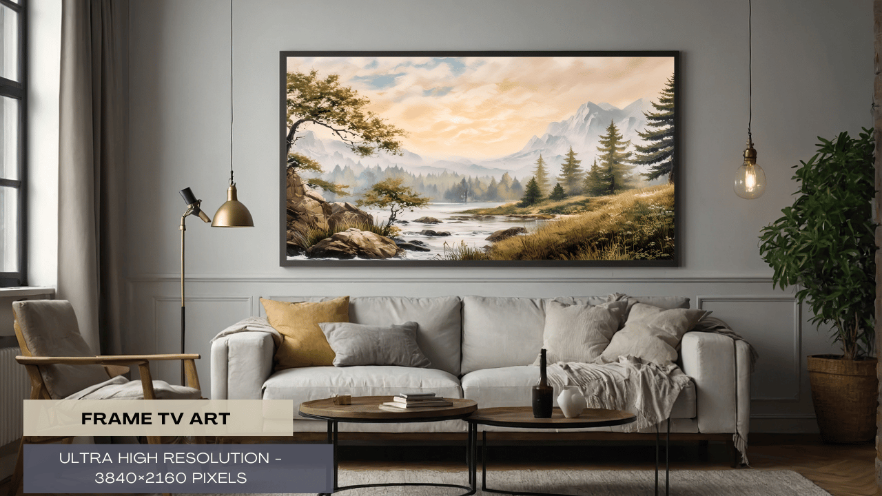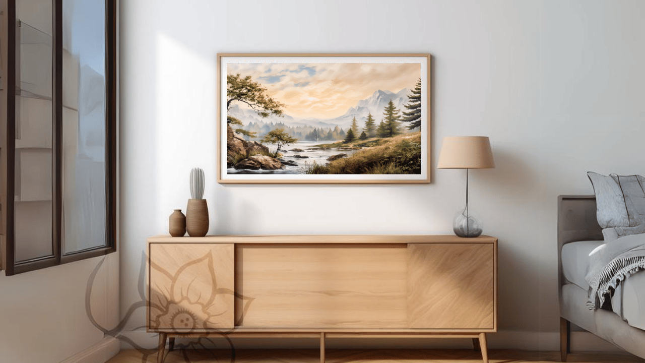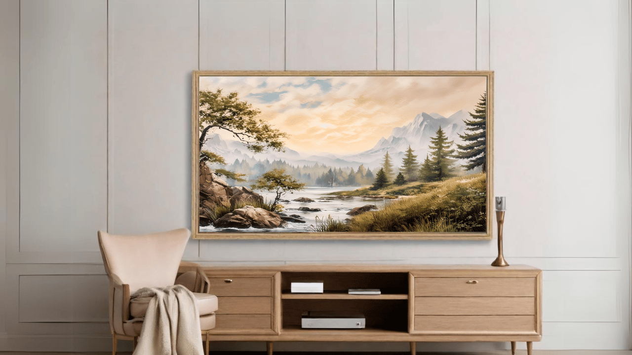 This gorgeous graphic artwork will transport you to a more beautiful place where a majestic mountain river flows through a stunning landscape. Any space in your house will feel more serene and dramatic with the sound of the rushing water and the towering peaks.