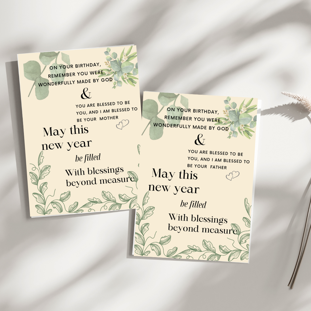 Enjoy these two printable birthday card, perfect for your son or daughter on their special day. Reminding them they are wonderfully made by God. Digital Download. One Card as your Father one card as your Mother. After purchase you will be able to print out your card and cut to size. You can print this on a card stock for a more professional feel. 5 x 7