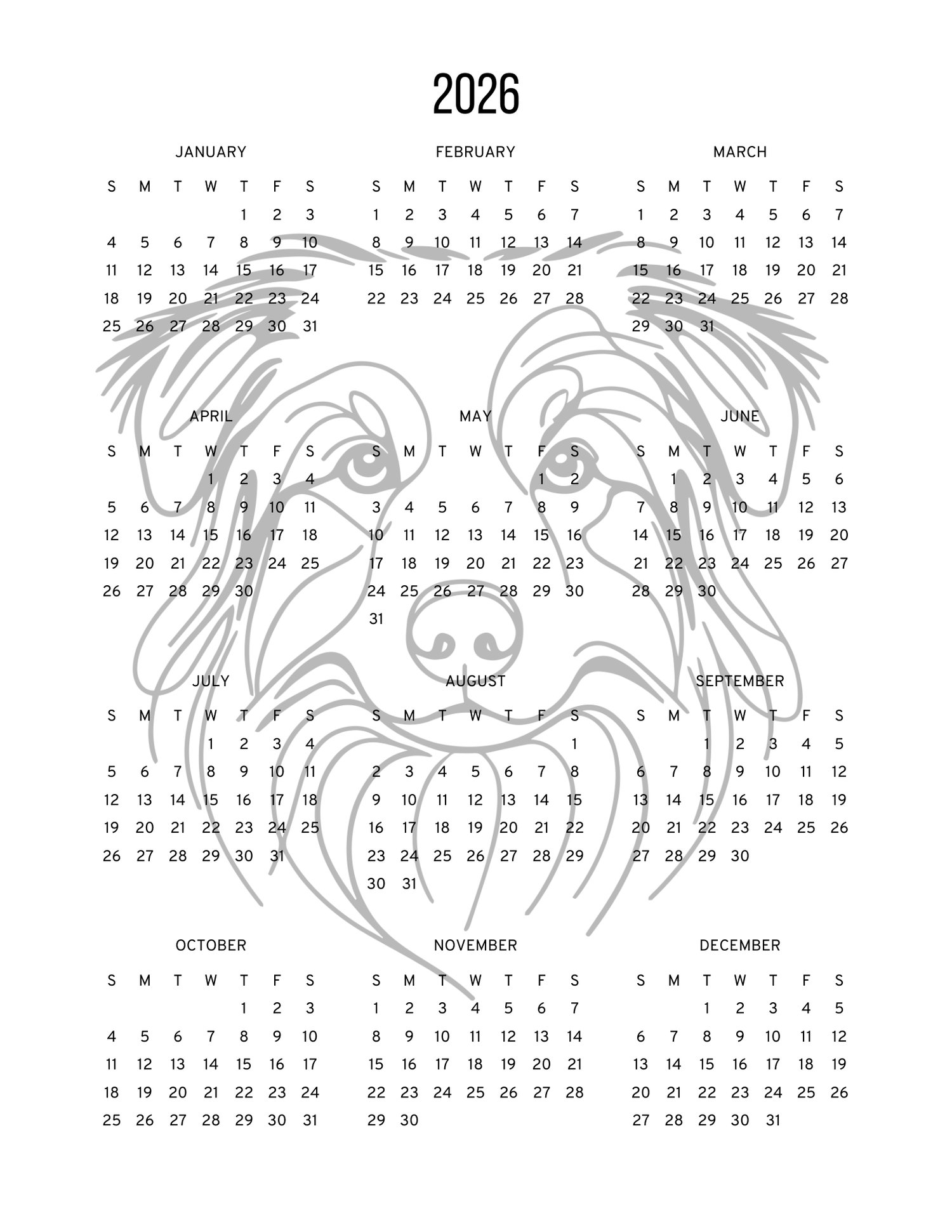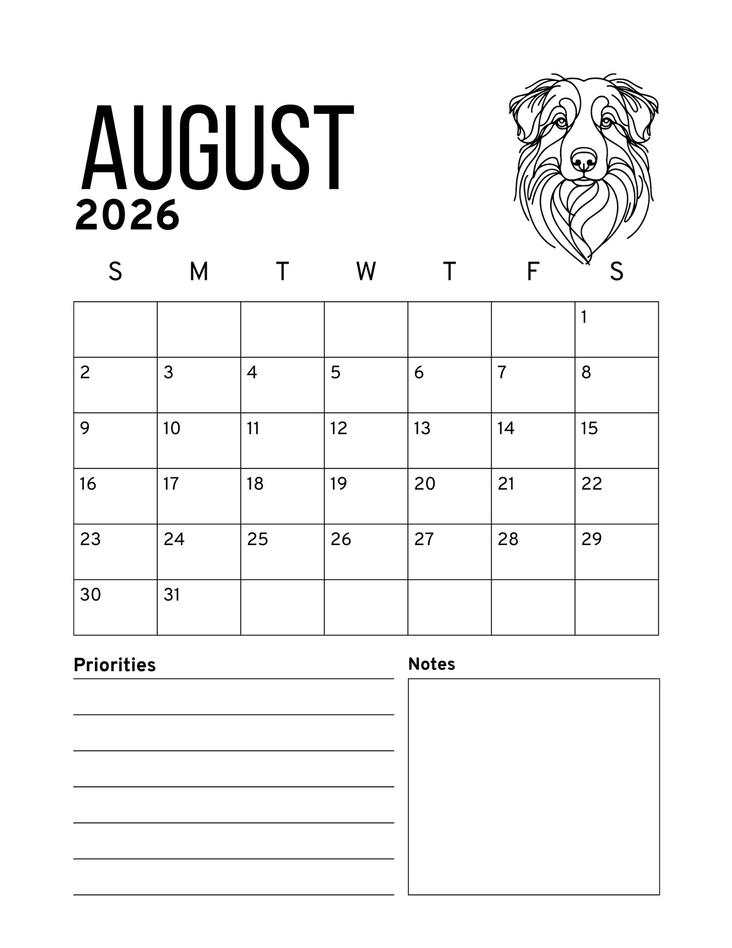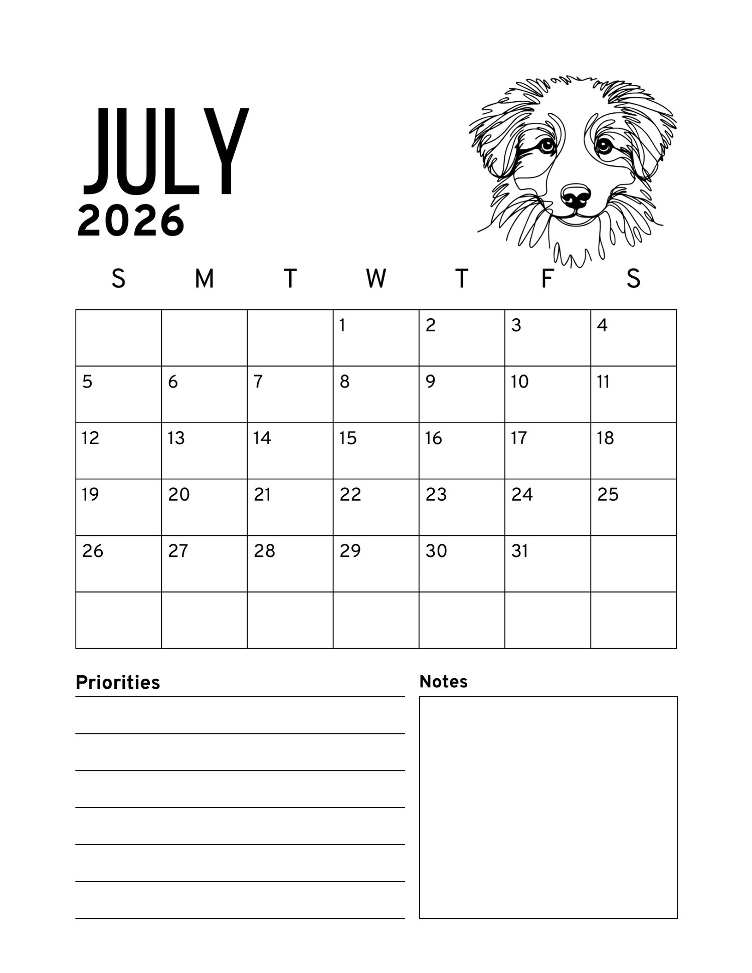Start the new year with the grace, beauty, and personality of the Aussie! This 2026 printable calendar brings the beloved Aussie breed to life month after month. Enjoy stunning Aussie-themed artwork throughout the year, or gift it to a friend who adores this loyal and elegant breed. Simply download, print, and enjoy a full year of Australian Shepherdjoy.