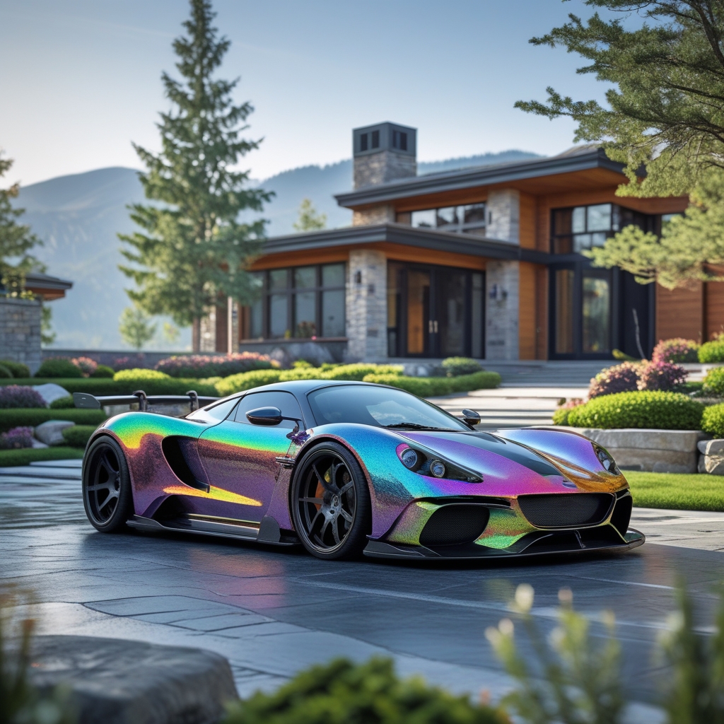 A stunning Chromaflair NILU hypercar, fully customized with a Brabus body kit, featuring sleek matte black mags wheels, parked in the driveway of a luxurious modern mountain house. The scene includes beautifully landscaped gardens with vibrant greenery, decorative shrubs, and elegant stone pathways. The car’s color shifts dynamically with the light, showing iridescent Chromaflair reflections. The modern mountain house has large glass windows, natural wood and stone accents, and a panoramic view of the surrounding mountains. Soft sunlight enhances the textures of the car and the garden, creating a high-end, cinematic, and ultra-realistic atmosphere.”