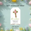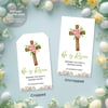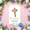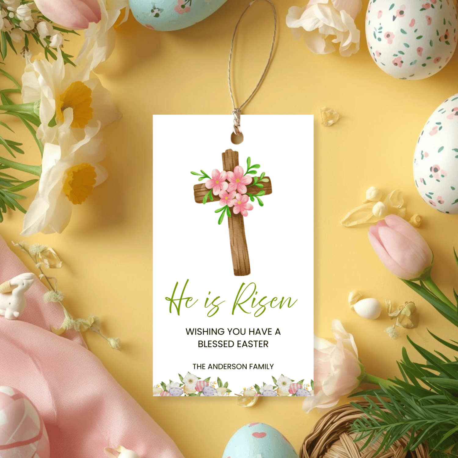These printable Easter gift tags feature the message “He is risen. Wishing you a blessed Easter.”, designed with a wooden cross at the center surrounded by soft florals. At the bottom, Easter flowers and decorated eggs complete the design, creating a beautiful and faith-filled touch for your gifts.