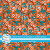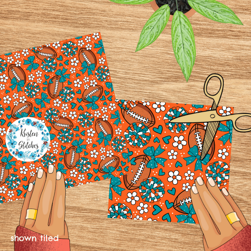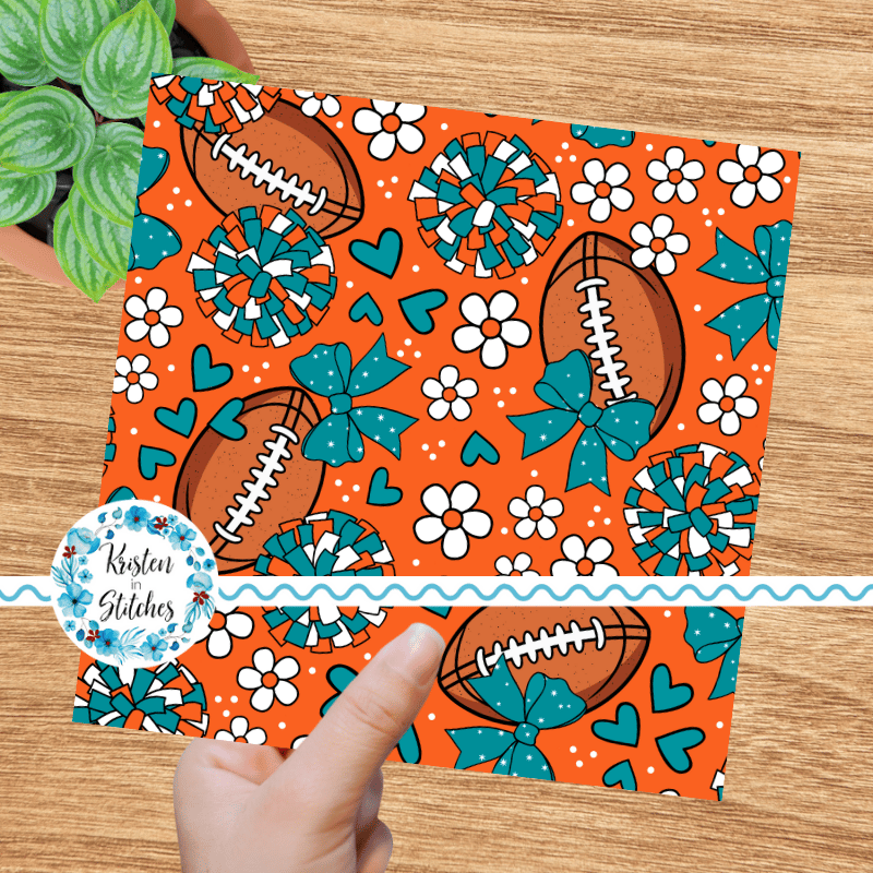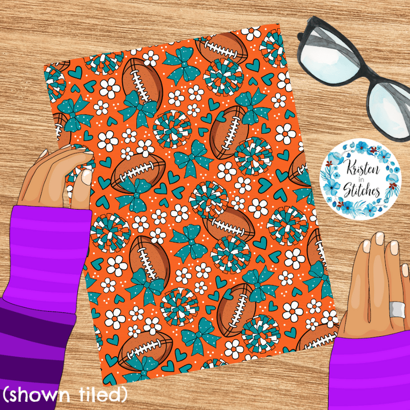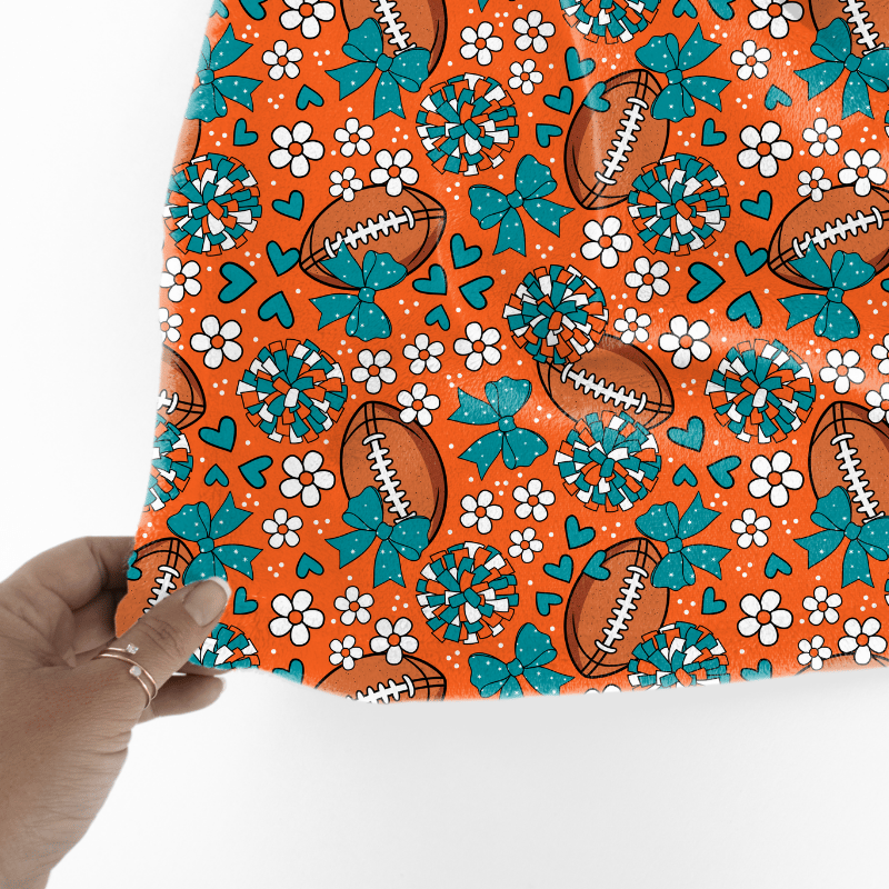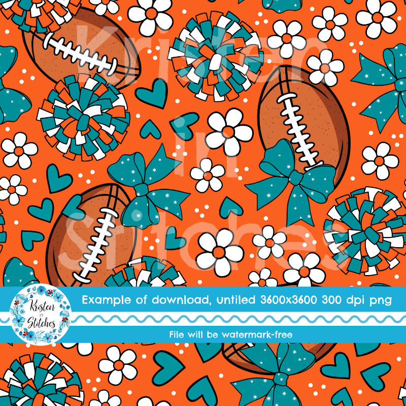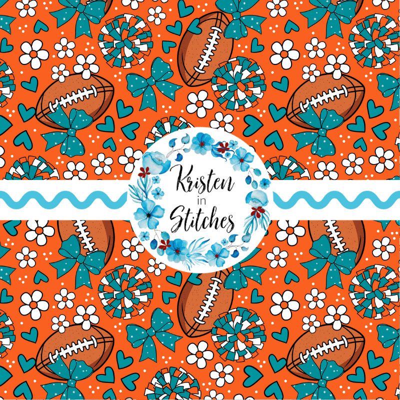 Floral pattern with daisy flowers, cheerleader bows, pompoms, footballs and hearts in Miami Dolphins colors.