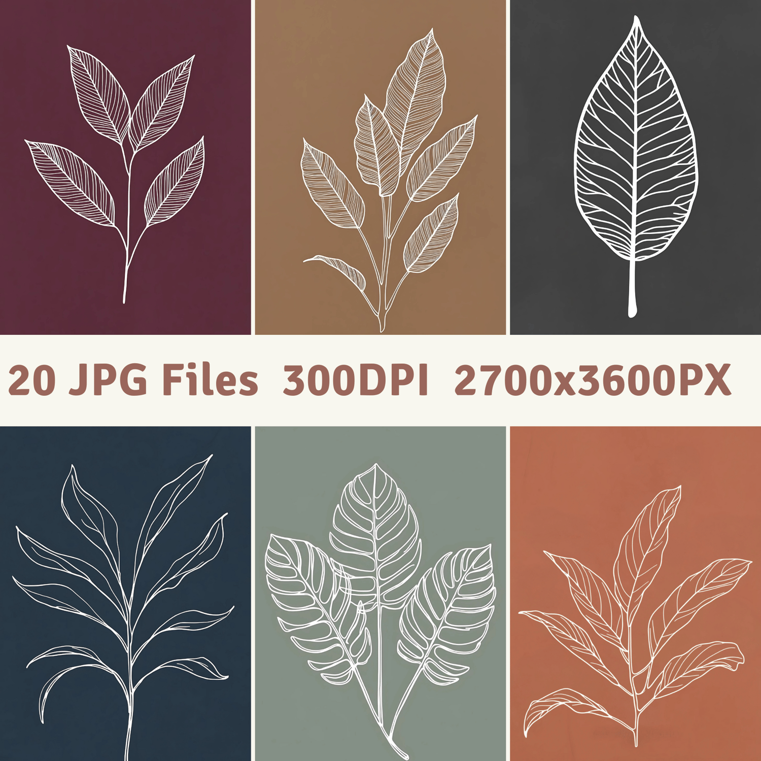 Bring timeless elegance and organic charm into your creative projects with this collection of minimalist botanical line art. Each design features a delicate white one-line illustration of popular plant species — like monstera, eucalyptus, banana leaves, ferns, and more — set against beautifully curated earthy backgrounds in soft terracotta, sage green, mustard yellow, dusty rose, and other warm, muted tones.