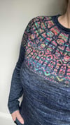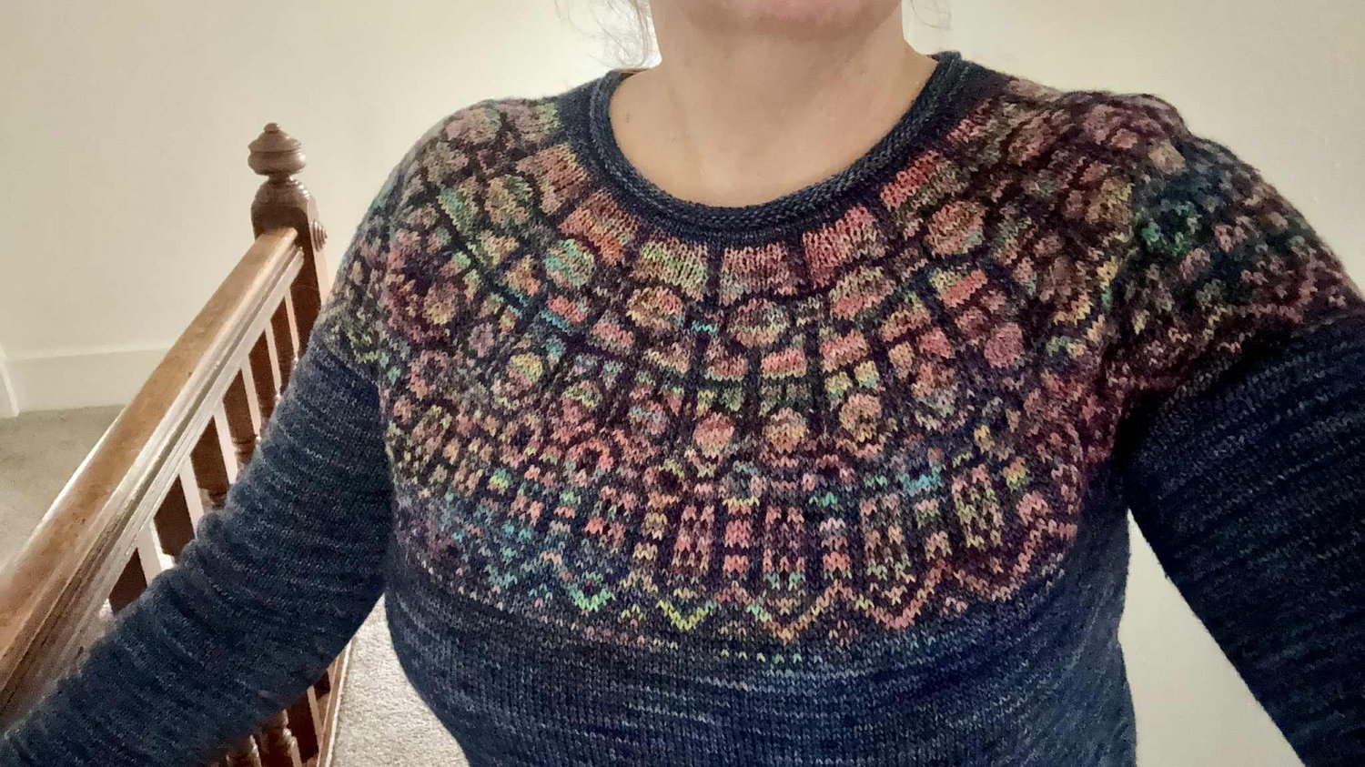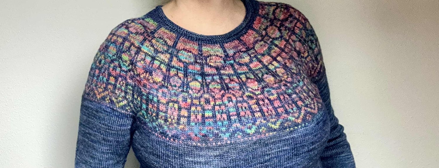 Knit in a deep, rich blue as the main color with bursts of vibrant contrast shades, this pullover truly evokes the light filtering through centuries-old windows. It’s a tribute to artistry, history, and the magic of colorwork.