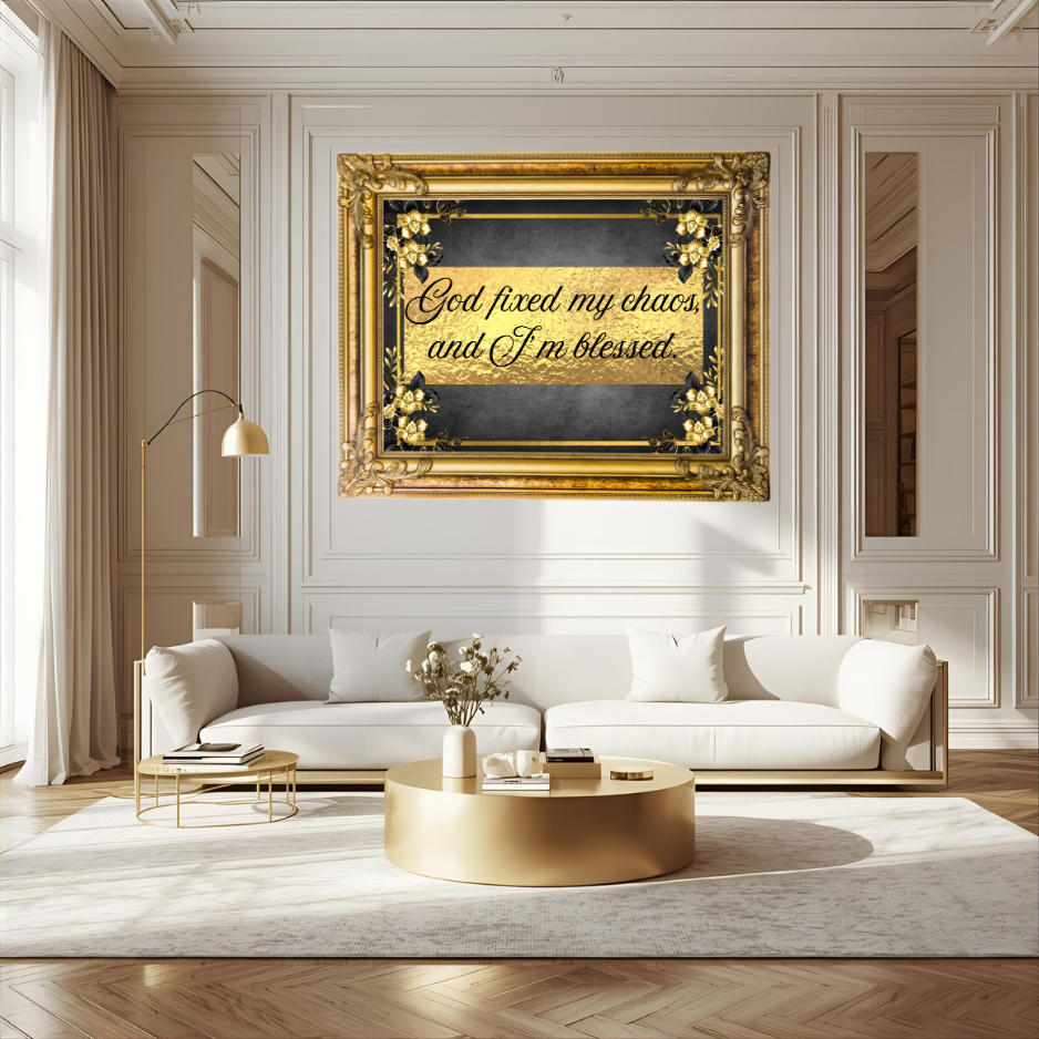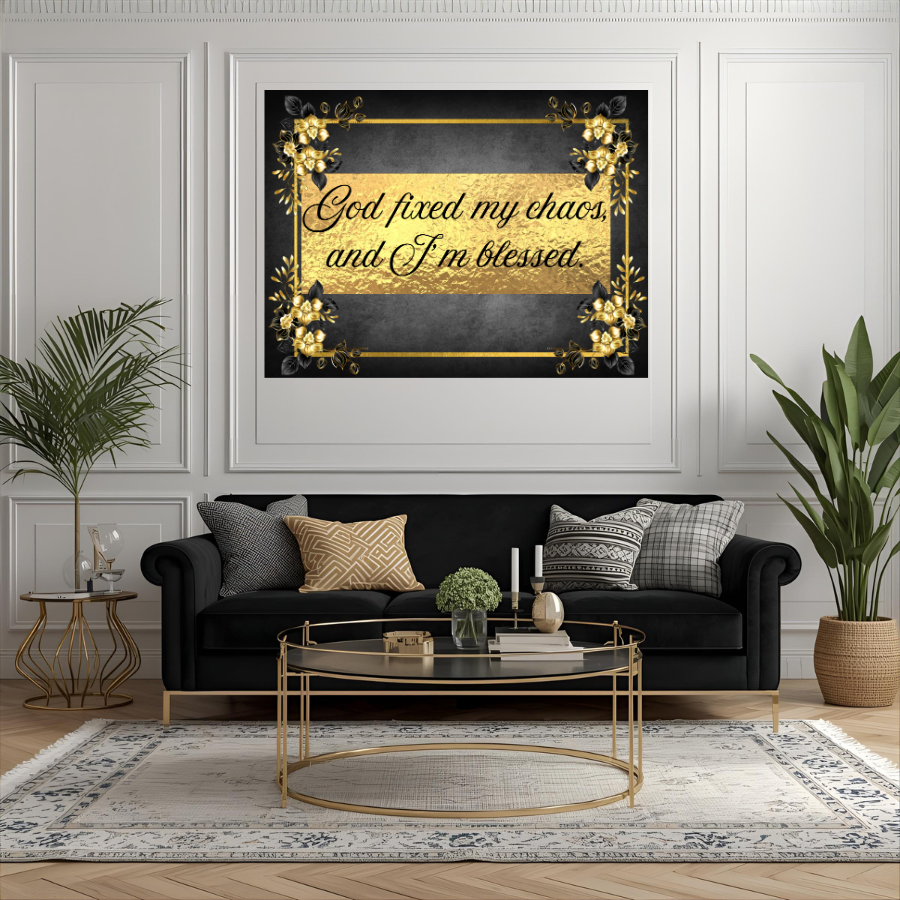 Download and frame this 24×18 black & gold “God fixed my chaos, and I’m blessed” poster. Perfect for home decor, gifts, churches, and faith walls.