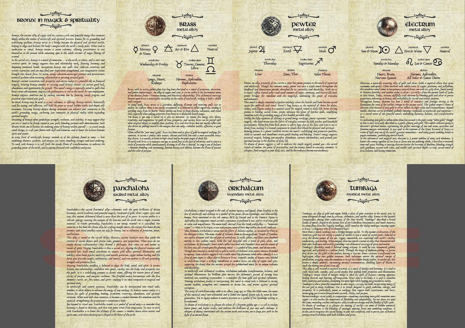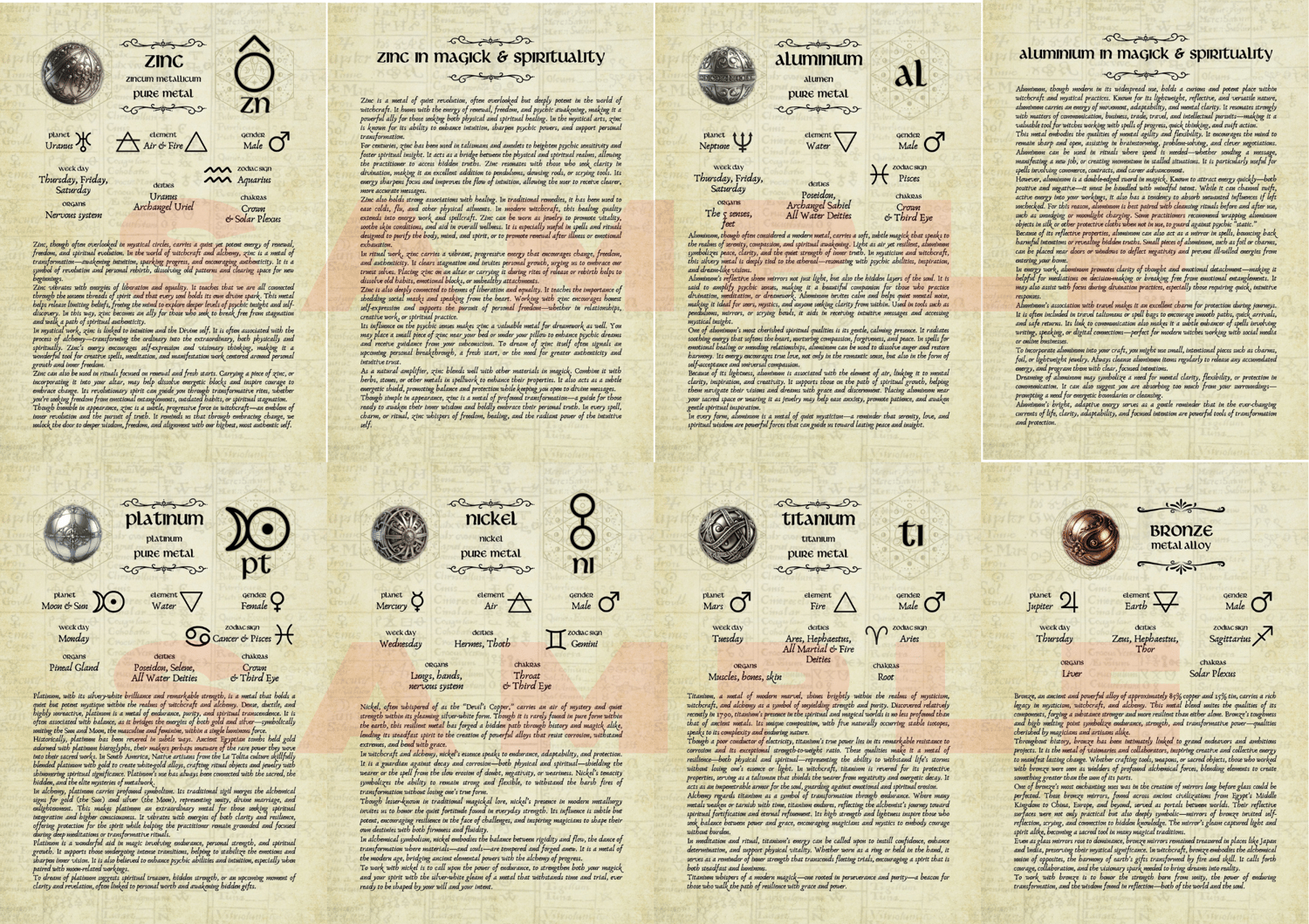 This collection explores the spiritual and magical properties of 20 powerful metals—from Gold, Silver, and Copper, to rare alloys like Electrum, Panchaloha, Orichalcum, and Tumbaga. Learn how Iron (and meteorite iron) protects, how Mercury transforms, and how Brass, Bronze, and Steel amplify spellwork. Includes correspondences, elemental ties, ritual uses, and more.