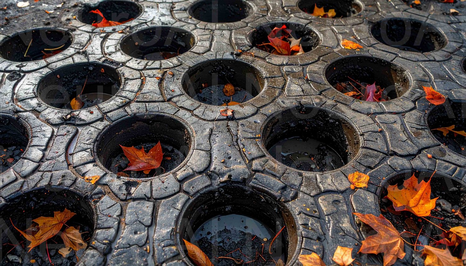 Autumn leaves scattered on wet, patterned surface