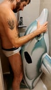 Nelson's inflatable dolphin was dirty, So Nelson decided to wash it in the shower.