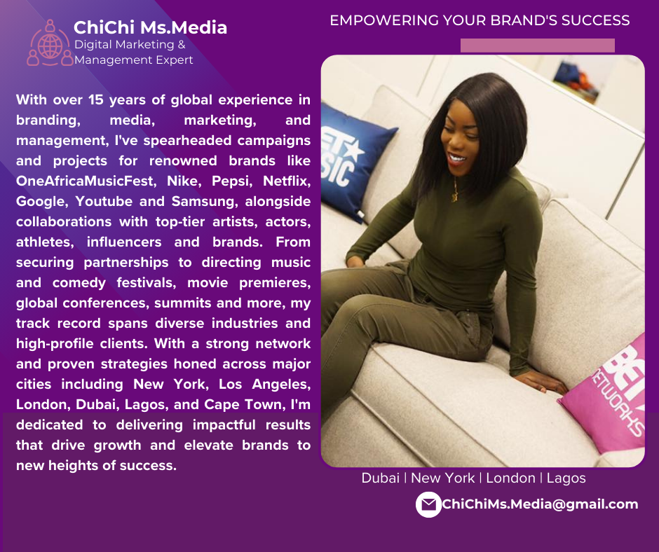With over 15 years of industry experience, I bring a wealth of knowledge and expertise to the table in branding, media, marketing, and management services. Throughout my career, I've had the privilege of working with esteemed brands such as One Africa Music Fest, Dubai Global Comedy Fest, Afroworld, Nike, Pepsi, Netflix, Youtube, Google, Samsung and many more, as well as collaborating with prominent artists, actors, athletes, and influencers. From securing partnerships and brand ambassadorships to directing music festivals, summits, and movie premieres, my portfolio spans a diverse range of projects and accomplishments.
