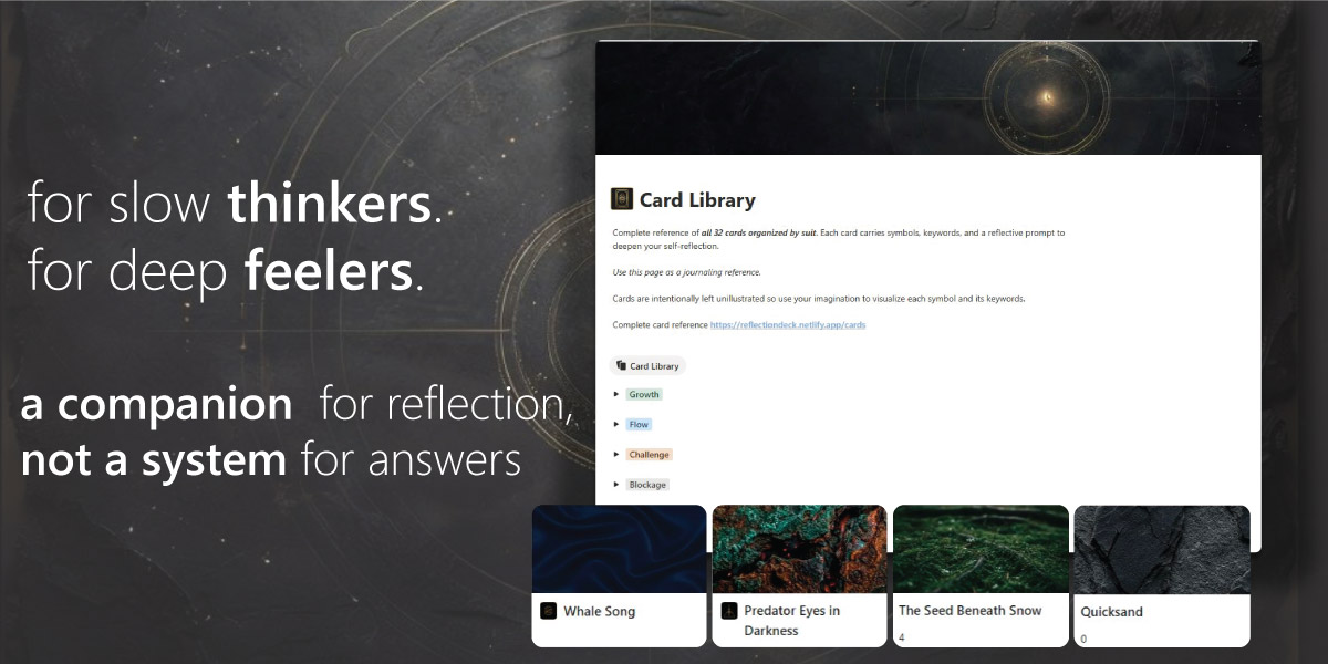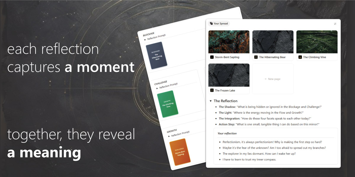 It supports slow and intentional self-inquiry, helping you observe recurring themes, emotional patterns, and insights over time, without pressure or daily tracking.