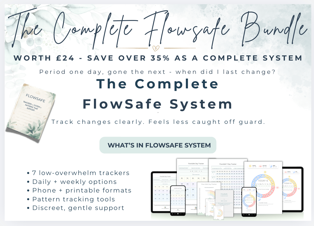 - 1x Best seller FlowSafe day tracker: print pages for each day of the week, plus an empty one for you to laminate and pin somewhere discreet, designed with carers in mind.