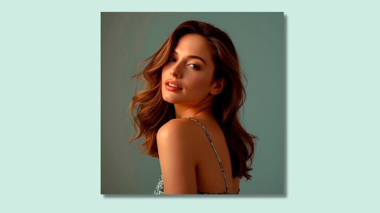 Cinematic frontal female portrait wall art printable expressing calm confidence, modern femininity, and refined presence.