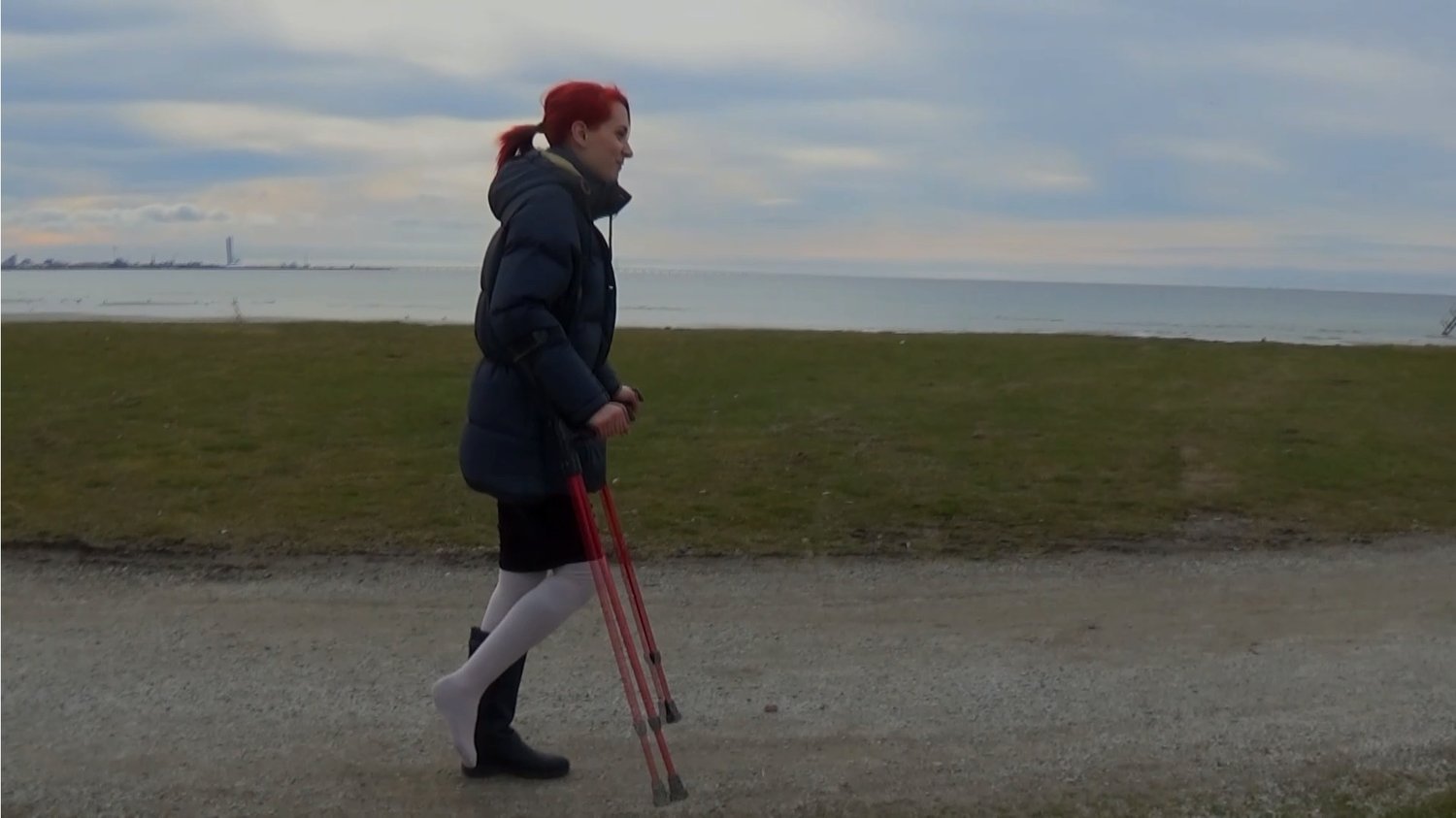 Sunshine is dressed up nicely as she’s heading to a friend’s house later in the evening to spend time with the girls, right now she’s on a walk in her crutches with her sprained foot to get some fresh air before it was time to go. She takes it nice and slow so that she wouldn’t get more hurt and has to cancel the girls evening. She stops a few times to take her time which is totally understandable and needed.