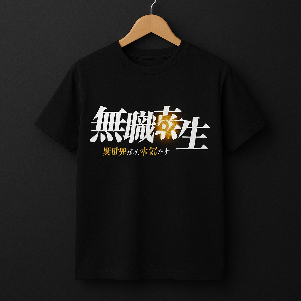 Dive into the world of reincarnation and magic with this exclusive Mushoku Tensei inspired black T-shirt. Featuring a bold anime design and perfect for every otaku and anime lover, this shirt brings the essence of adventure and fantasy to your daily style.