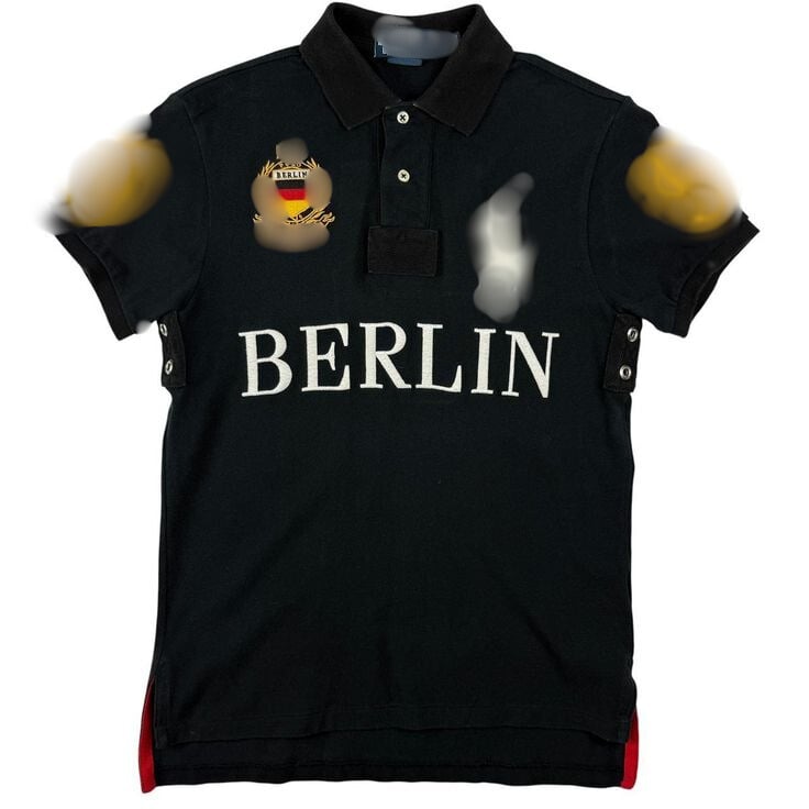 Bold black polo featuring detailed crest-style embroidery and contrast red/gold accents inspired by Berlin’s iconic heritage. With athletic sleeve numbering and a tailored fit, this piece merges classic prep with modern street style.