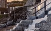 The focal point of this royalty-free stock image is the mass of pebbles strewn on the step in the foreground. These stones are cast upon all the steps leading down to the beach, even being flung over the 20-30ft sea wall. This seems such a common hazard that local houses above the sea defences have window shutters to protect the glass from shooting stones!