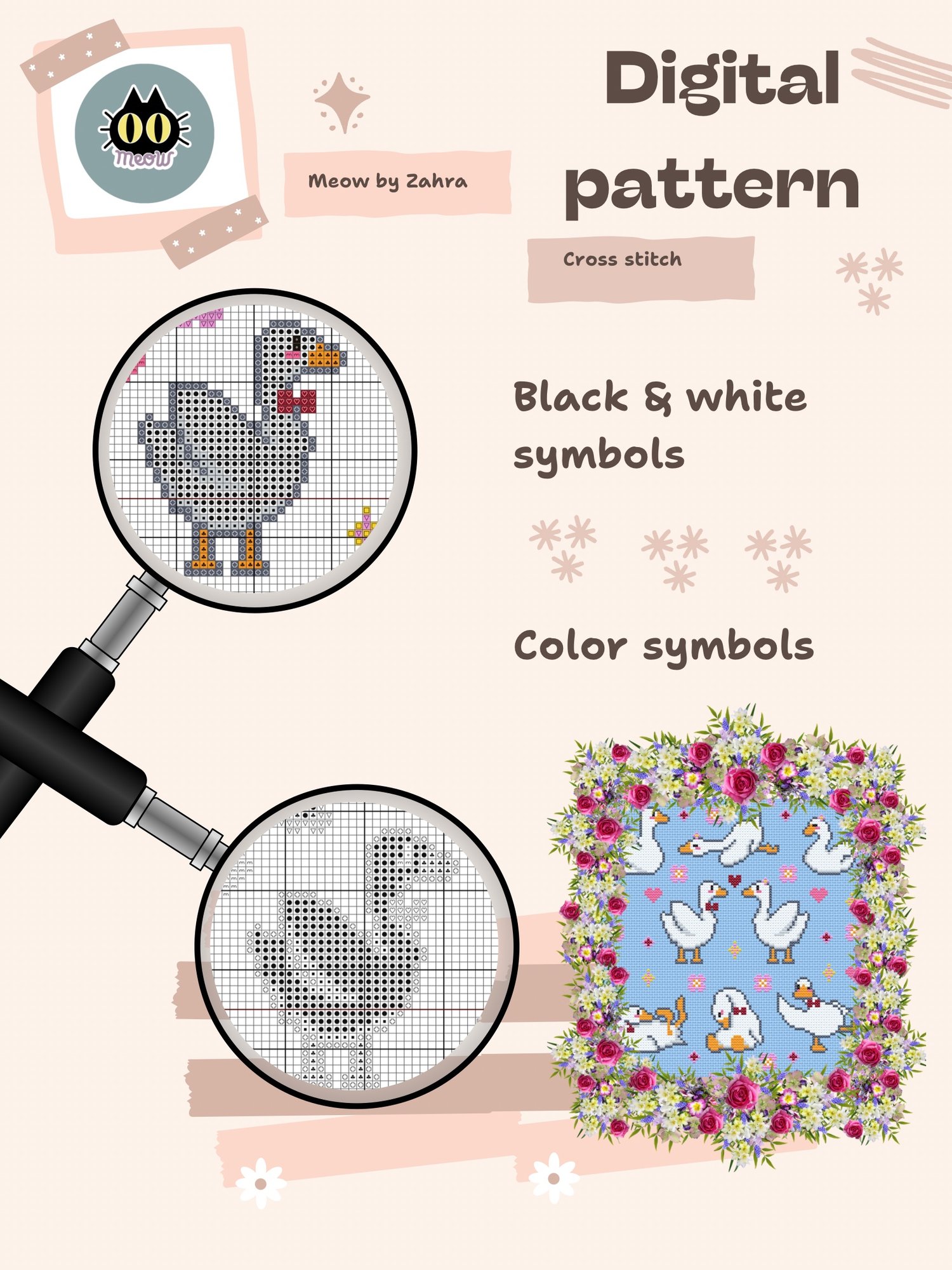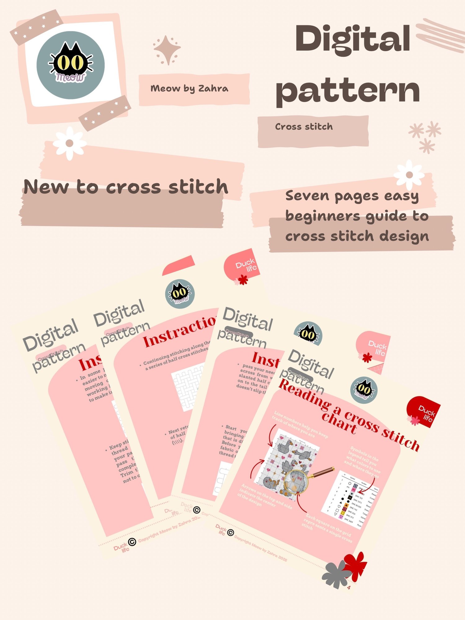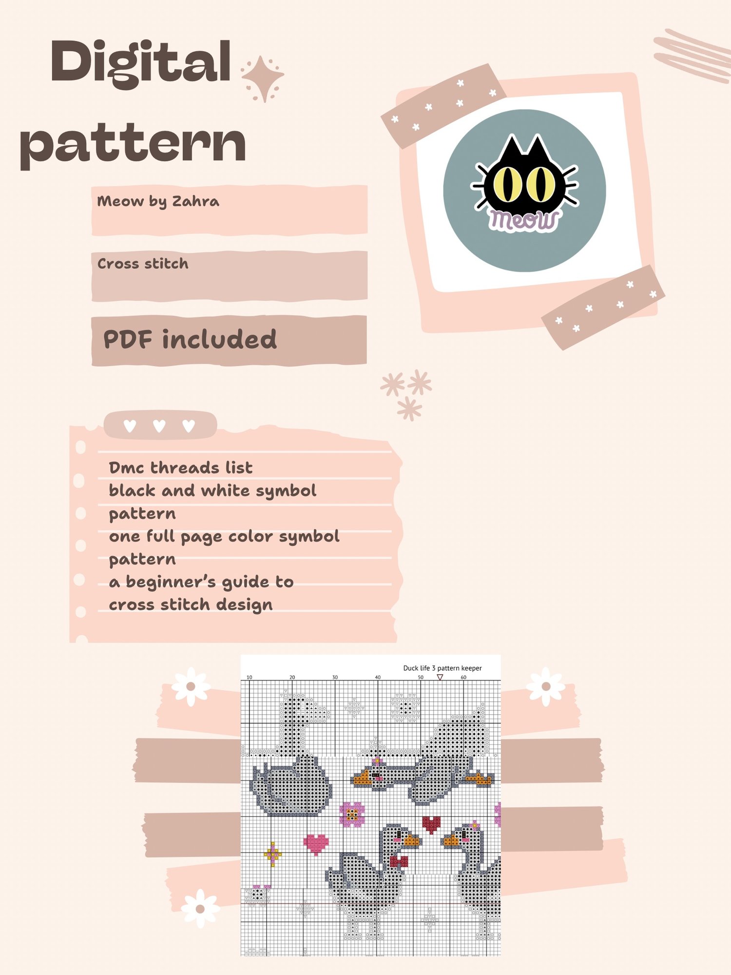 - 4Pdf files with detailed instructions of the cross stitch design. Floss list, symbol
