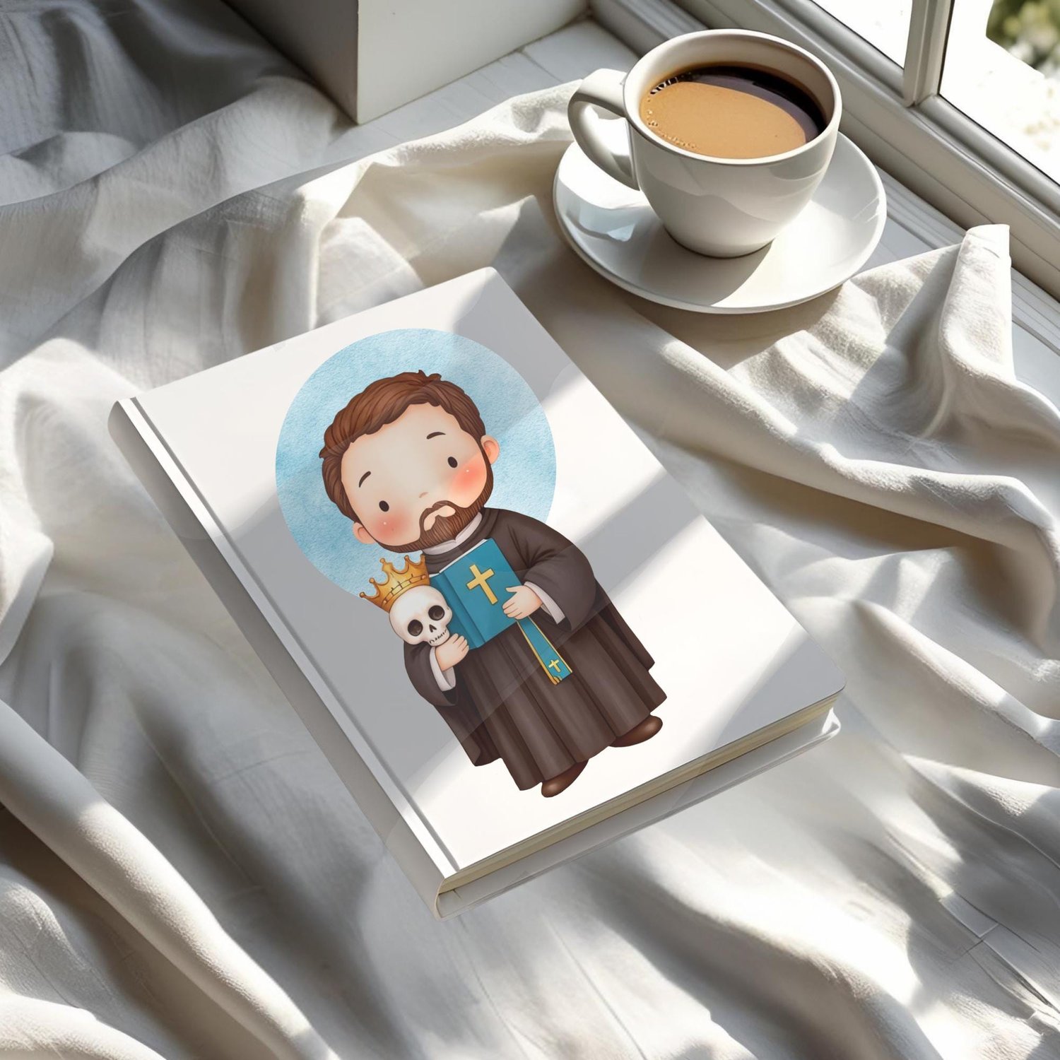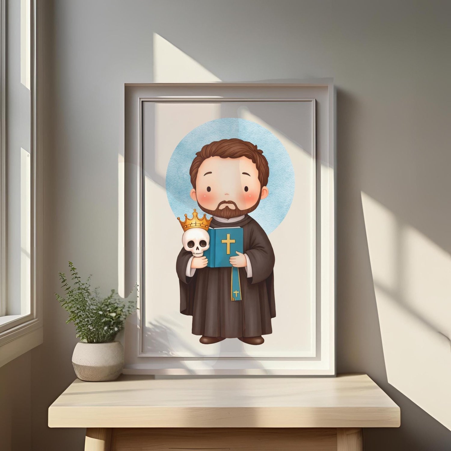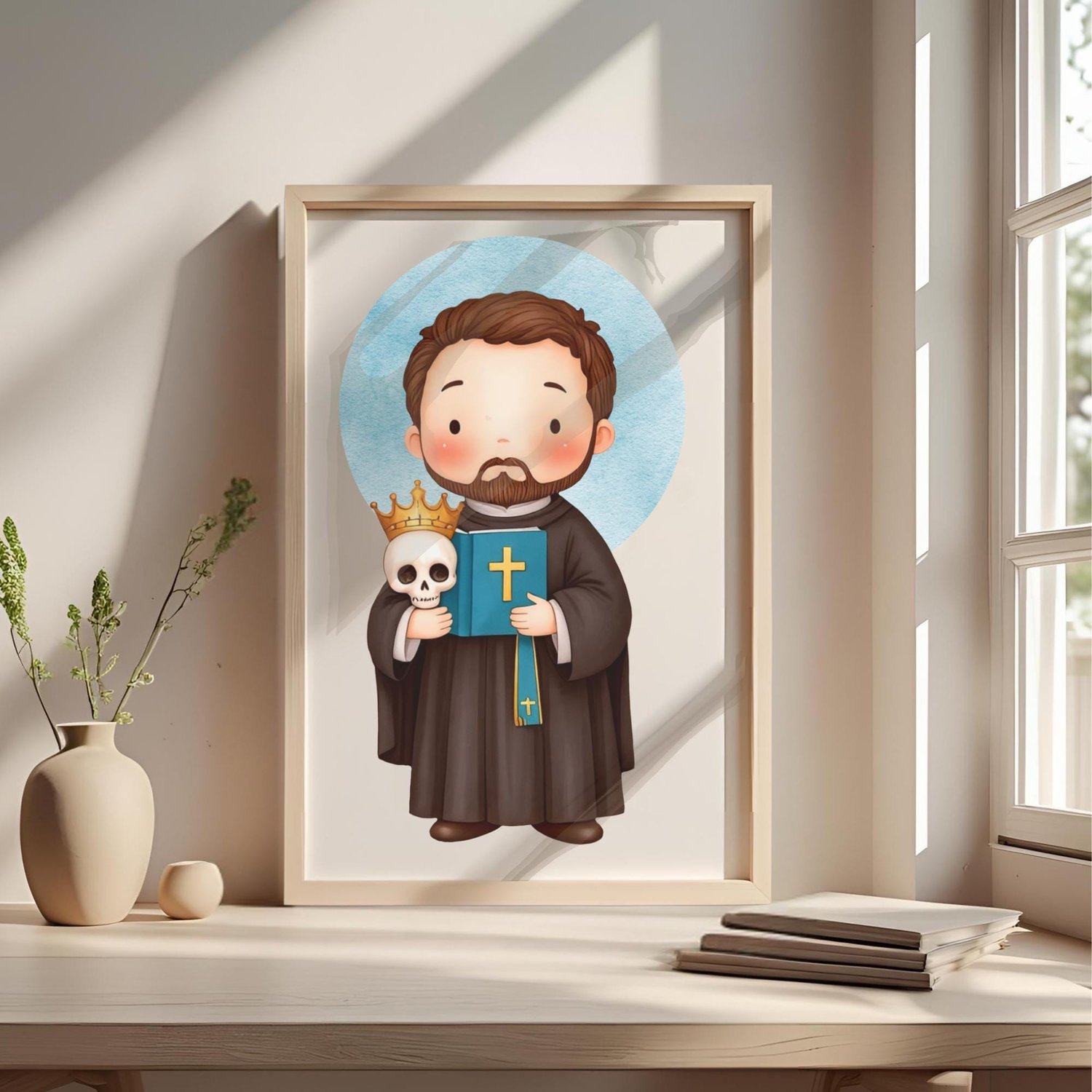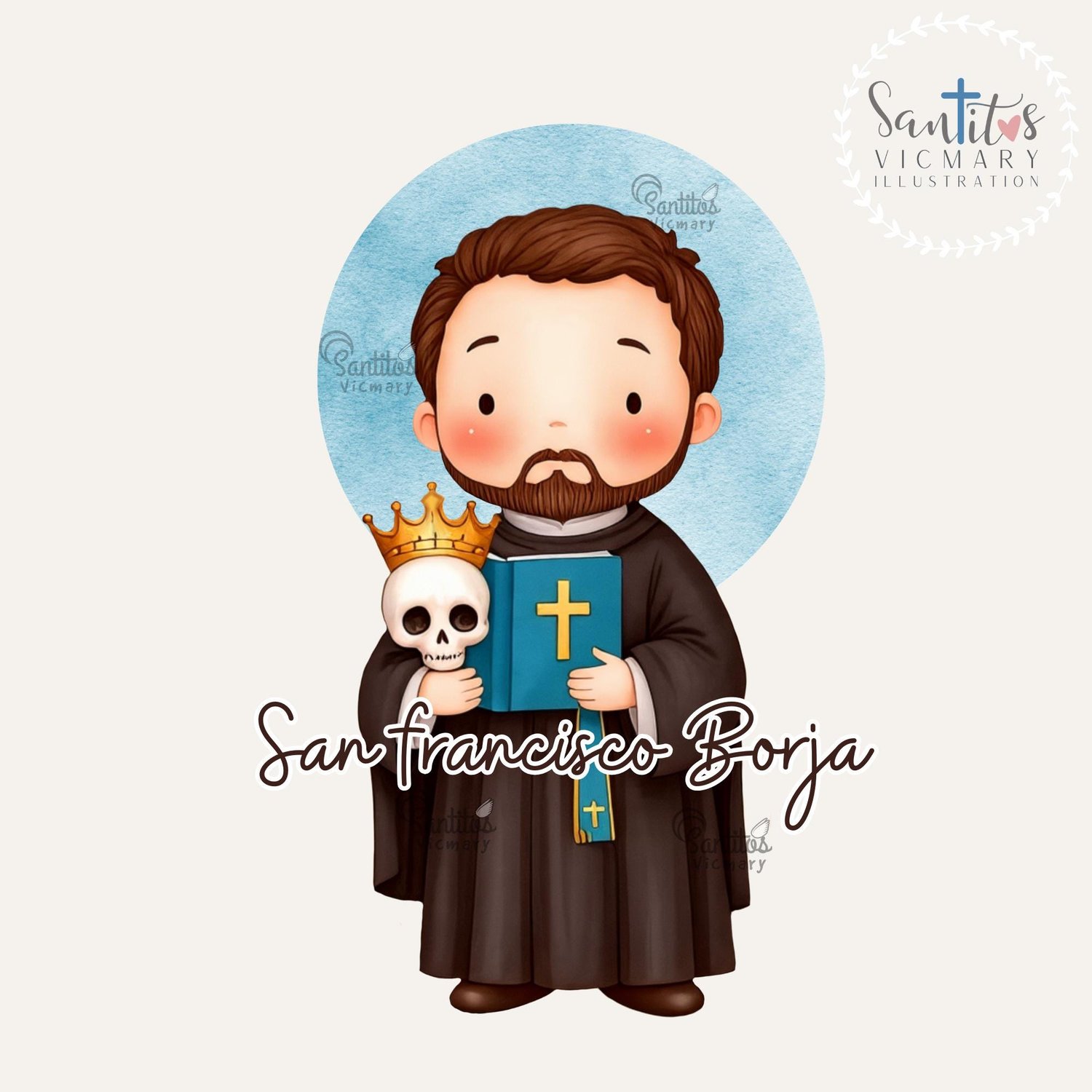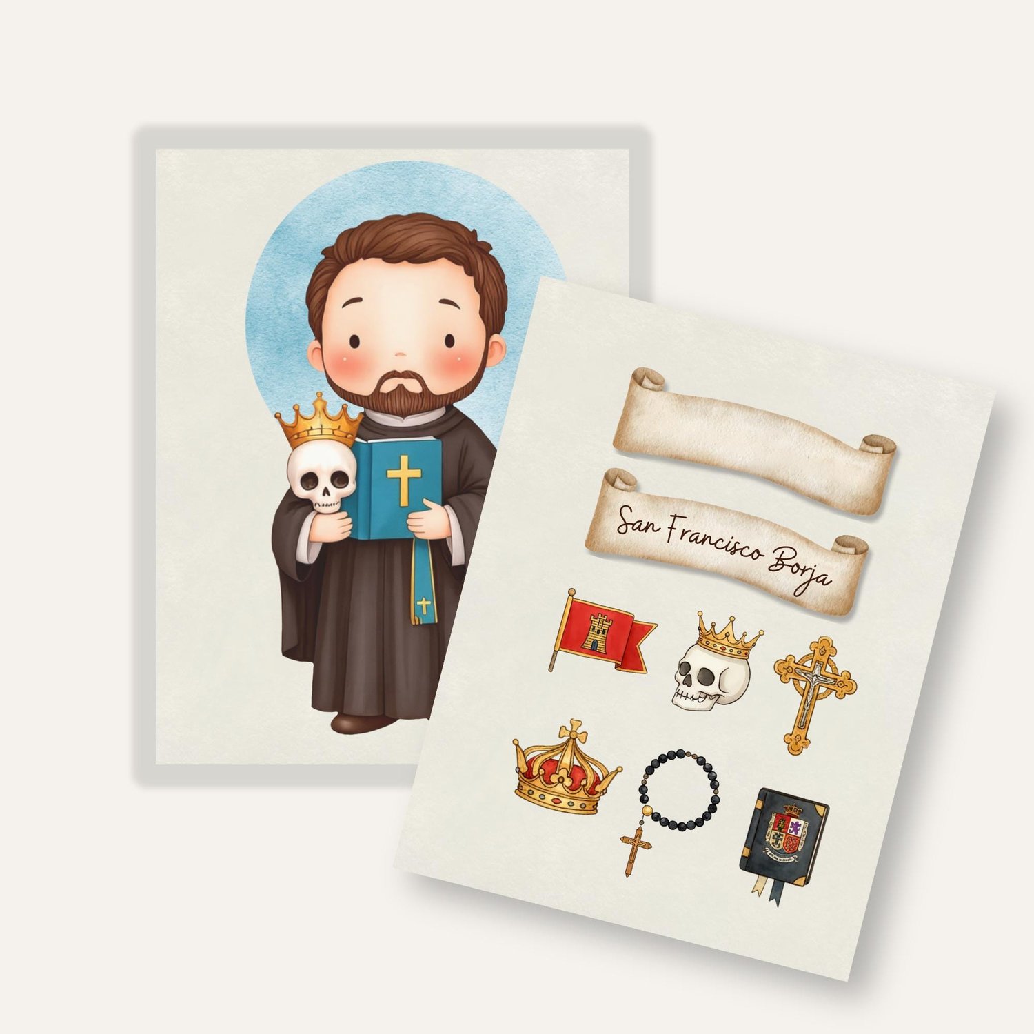 ¡Un poderoso Icono Digital de San Francisco de Borja en estilo kawaii! Este kit captura la historia del gran duque y jesuita con símbolos como la calavera, el libro y la corona.