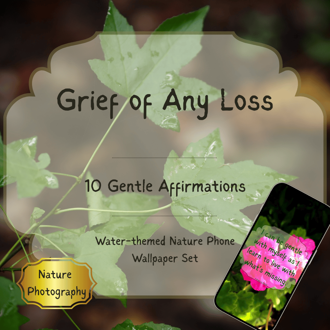 Personal growth often happens gradually, through moments of reflection and self-compassion. This affirmation set pairs 10 supportive affirmations for healing grief of any kind of loss with peaceful water-inspired nature photography. The imagery of water symbolizes renewal, emotional flow, and calm, creating a soothing visual companion for your personal healing journey. Each wallpaper offers a gentle reminder that growth can unfold naturally and that you deserve patience and compassion along the way.
