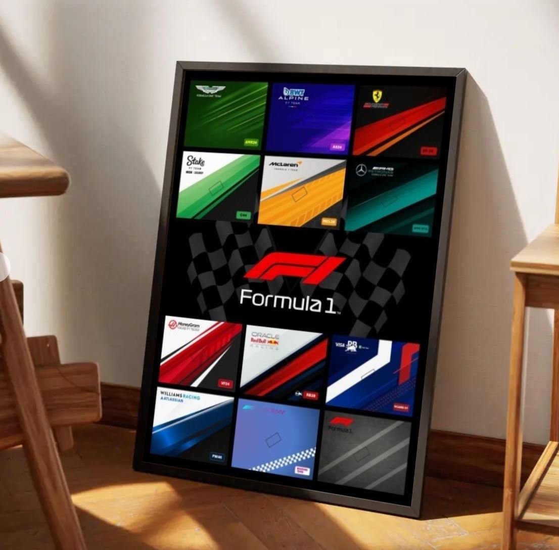 Chaque emplacement reprend les couleurs et styles des 12 écuries officielles F1 – saison 2024, avec un fond sombre percutant, des lignes dynamiques et une citation marquante.
