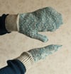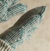 In the mittens shown in the photos, the main color is pale grey and the contrast color is blue.