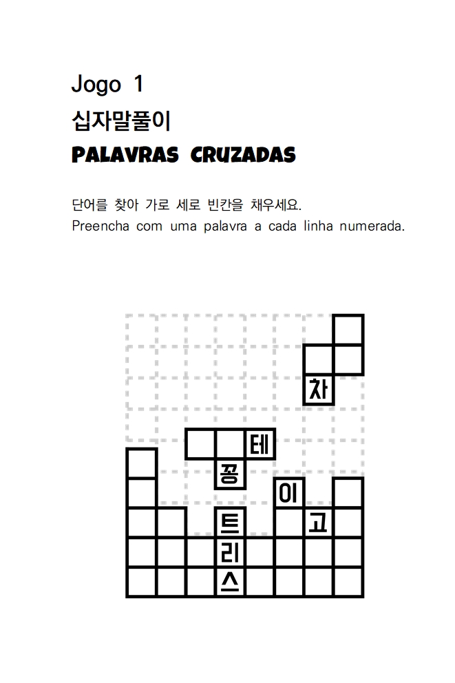O livro oferece cinco tipos de jogos de palavras em coreano, tais como Palavra Cruzada e Caça-Palavras.