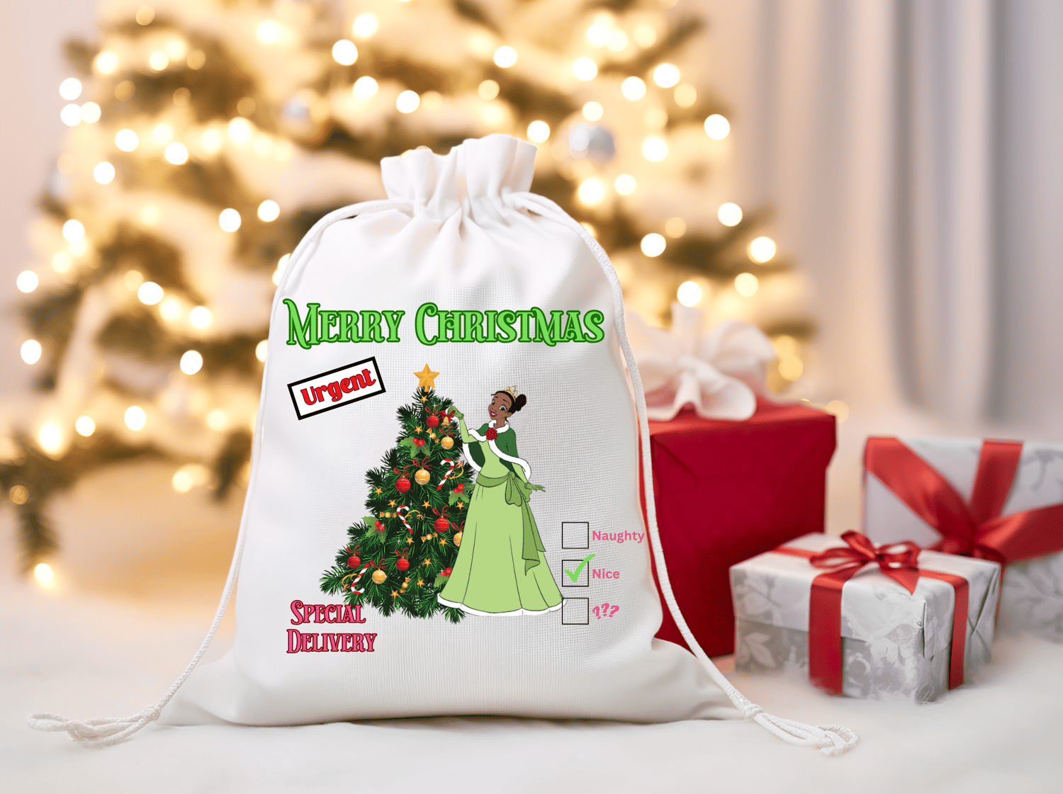 Celebrate the Holidays with Merry Christmas Tiana Santa Sacks!
