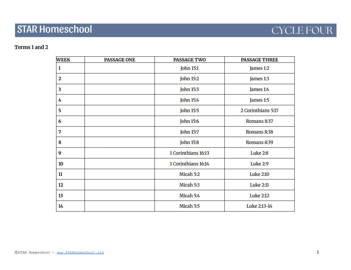 Claritas Publishing schedules a Bible passage each week for twenty-eight weeks. If you begin with Claritas when your child is in kindergarten, you will get through all four cycles three times. Because of that, I decided to create two alternative passages for each of the twenty-eight weeks. “Passage One” is blank, because that information can be found in the Claritas Publishing Cycle 4 memory work guide.