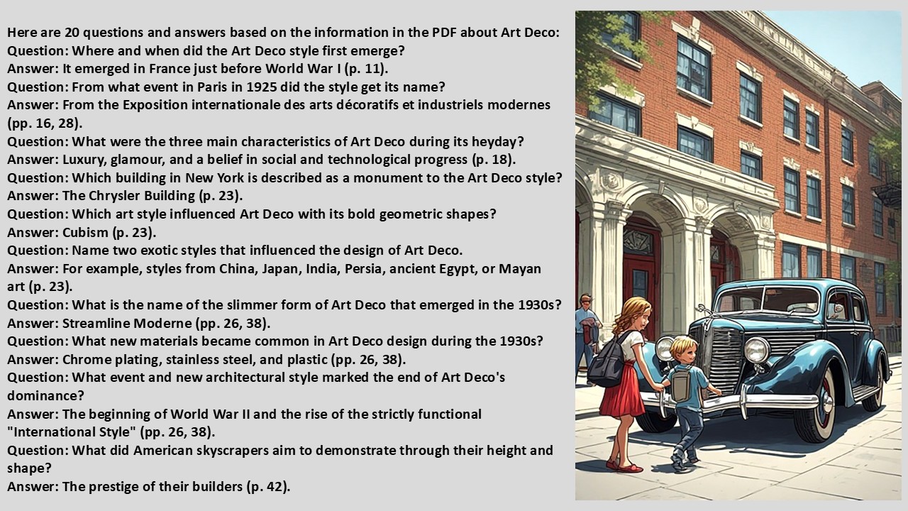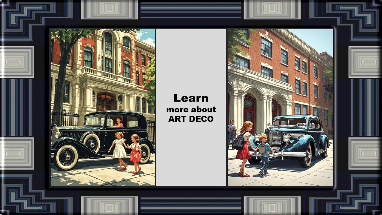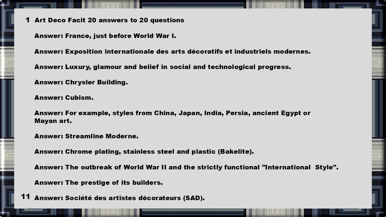Art Deco was a very exciting period. The architecture was given a stylish line. Sharp corners were rounded off. The iconic Chrysler Building in New York is an example. The slide show in the Educational Edition has 50 pages and the edition without elements of questions for education a few fewer. American teachers in that school system have given the highest grades in writing on TPT (Teachers Pay Teachers). Look at the store's first page far down, written reviews. It took 4 hours to make the slide show and another 2 hours to make the educational part. Questions and answers, as well as a model for automatic correction of the questions. Counted all the time as a teacher or expert saves time just once,