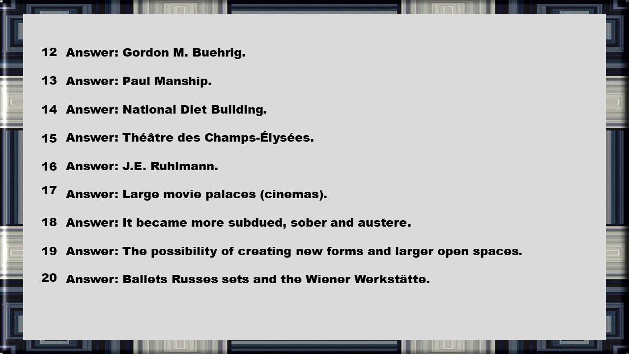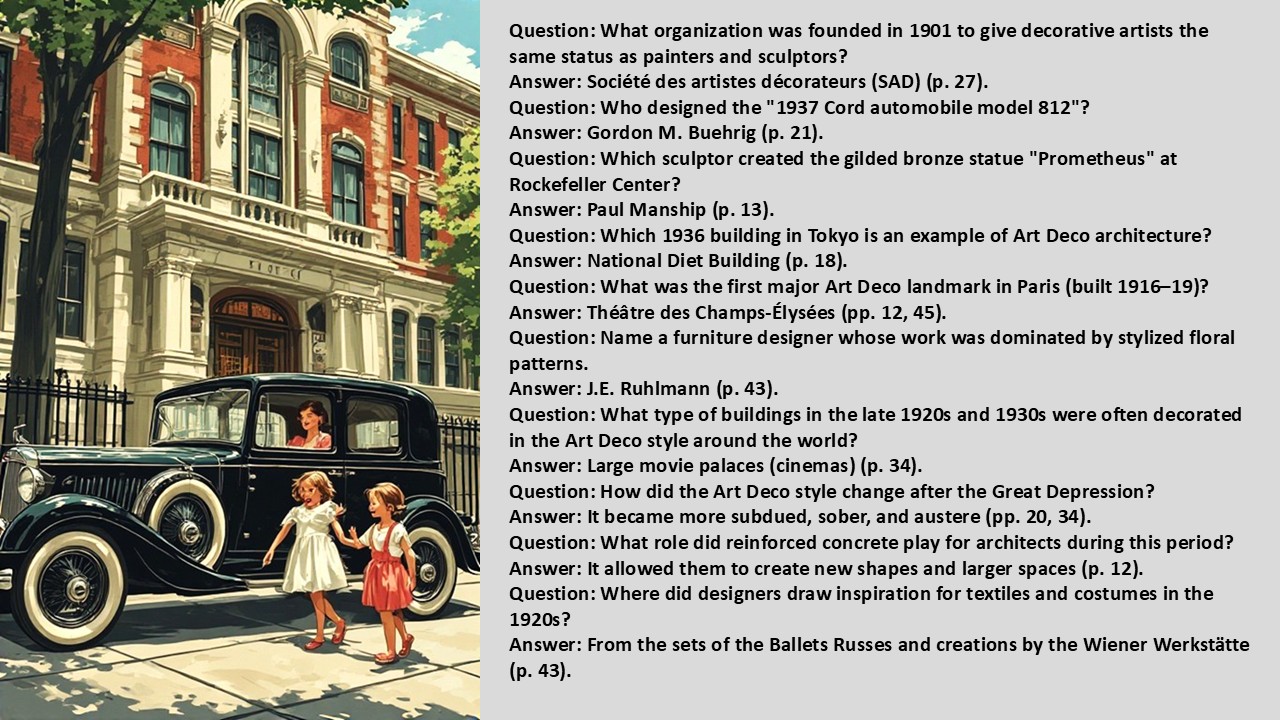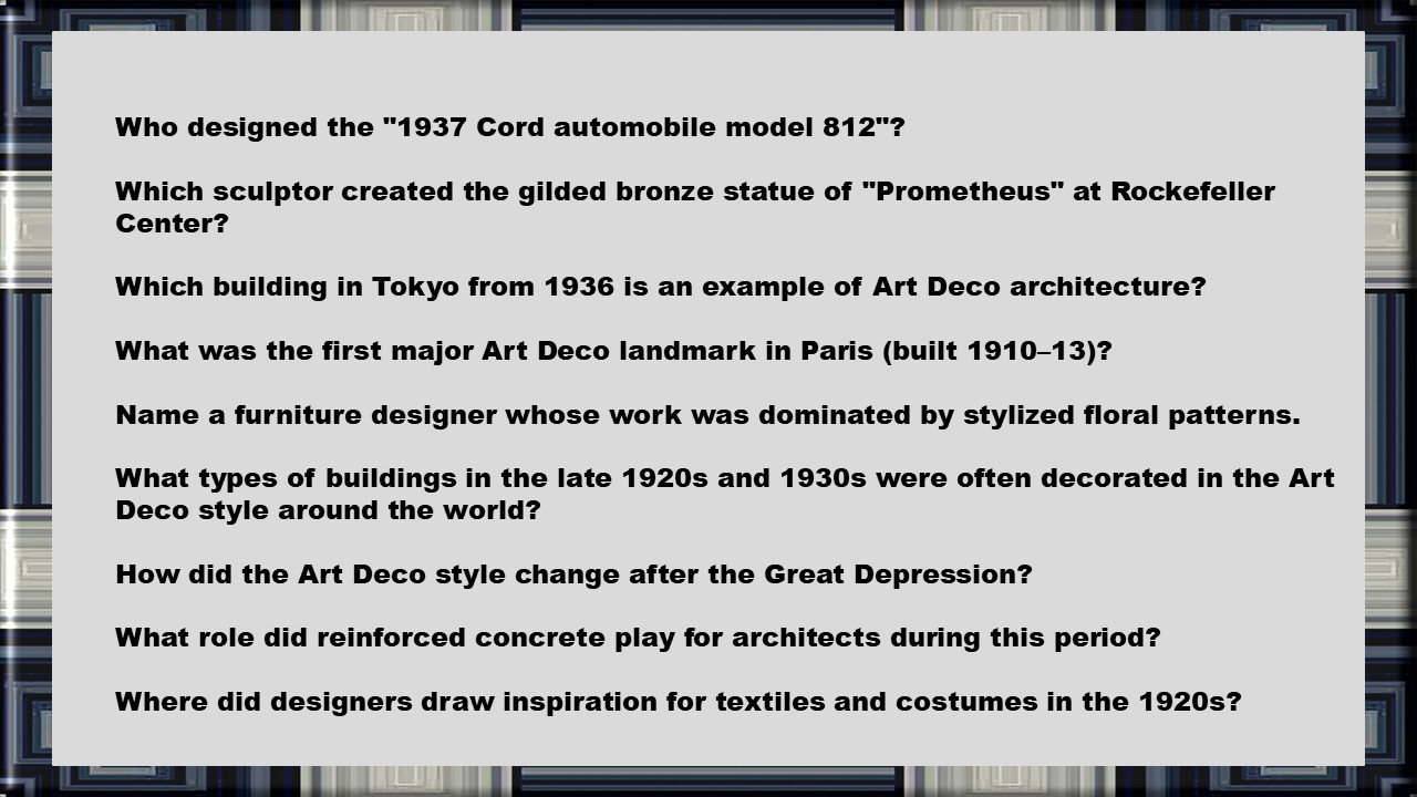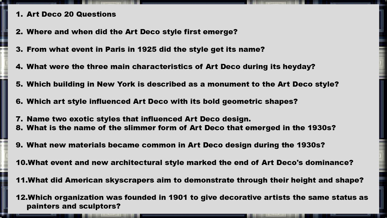 Art Deco was a very exciting period. The architecture was given a stylish line. Sharp corners were rounded off. The iconic Chrysler Building in New York is an example. The slide show in the Educational Edition has 50 pages and the edition without elements of questions for education a few fewer. American teachers in that school system have given the highest grades in writing on TPT (Teachers Pay Teachers). Look at the store's first page far down, written reviews. It took 4 hours to make the slide show and another 2 hours to make the educational part. Questions and answers, as well as a model for automatic correction of the questions. Counted all the time as a teacher or expert saves time just once,