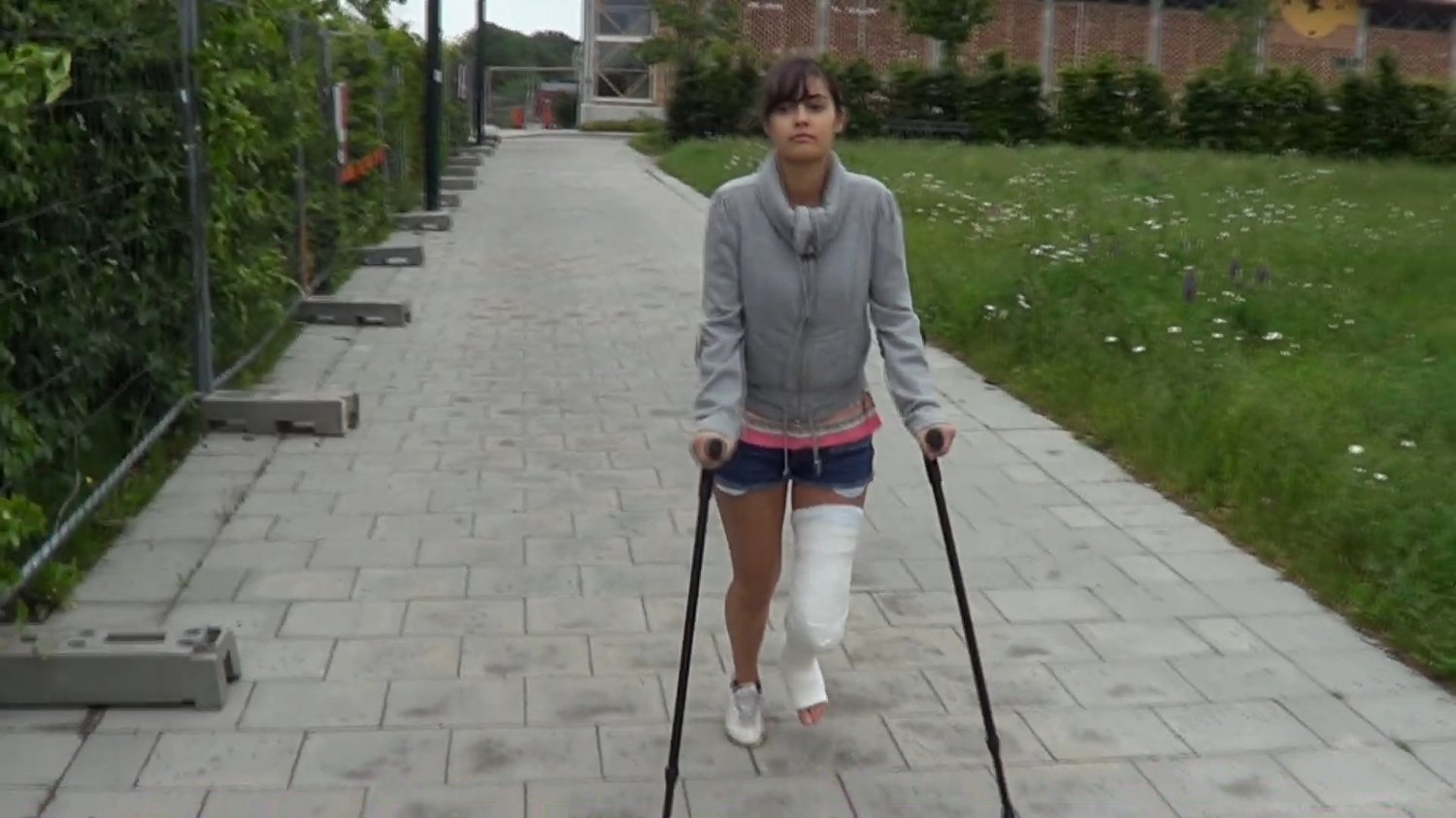 Elisabeth has a plaster long leg cast on her left leg and is crutching out from the parking house.It can be hard to crutch so she sits down for a short rest and then take both crutches in one hand and atsrt hopping on one leg.If it was hard to crutch this is a mightmare so she soon start using her crutches again.