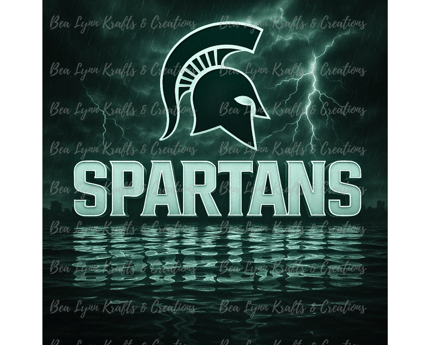 ⚡🛡️ Spartan Nation, prepare for battle! This Michigan State Spartans PNG is built for the most diehard fans who live and breathe green and white. Featuring the iconic Spartan helmet logo looming over a bold “SPARTANS” wordmark, the design floats above stormy water with a powerful mirror reflection below. Lightning strikes crack through the dark sky, giving this artwork the raw energy of game day in East Lansing.
