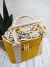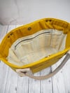 This little bag is perfect for toting your craft WIP wherever you go. I have used it on the train for my knitting! The handle is designed to fit over your arm leaving your hands free to craft in a queue.