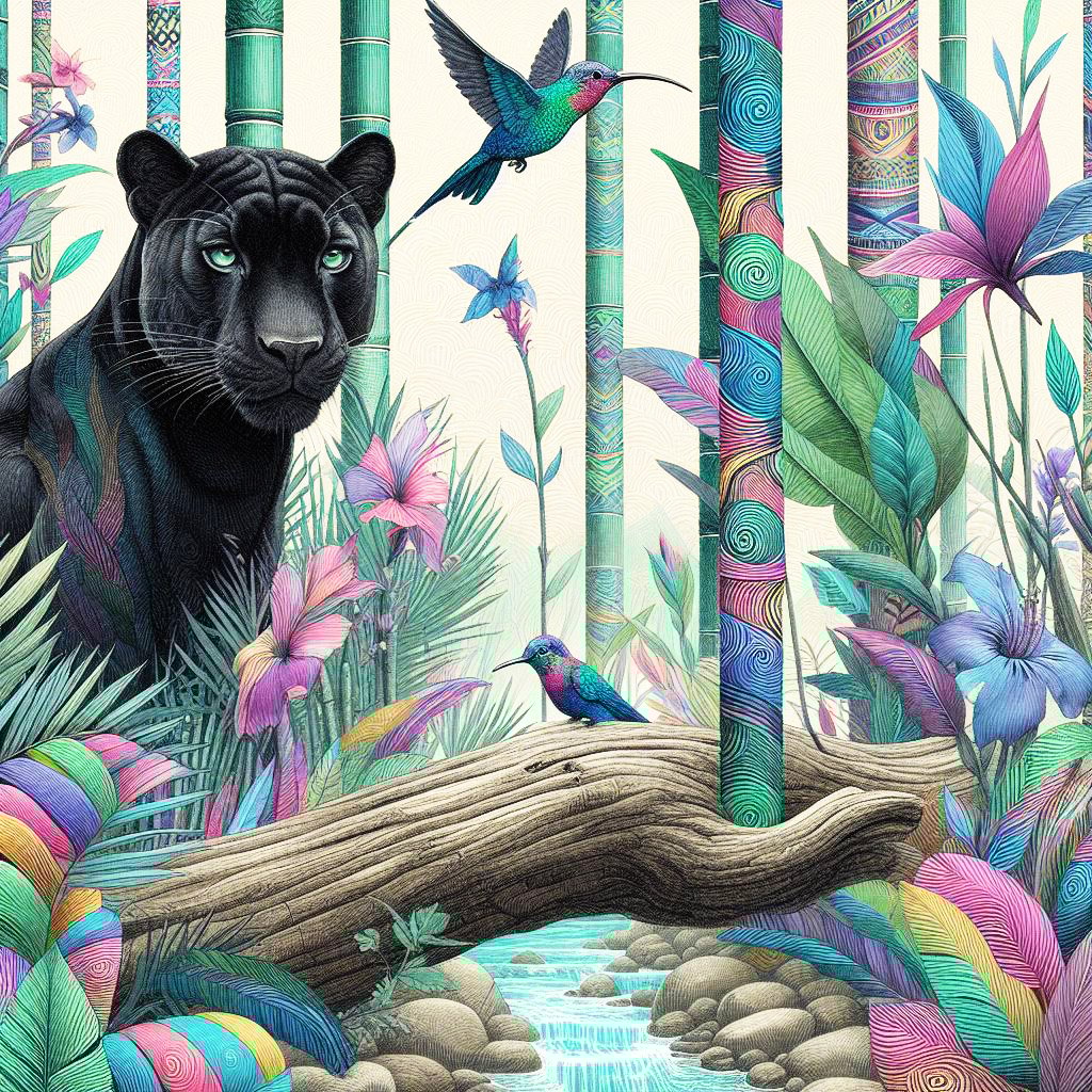 Black panther in a jungle with bamboo which is patterned around him & a tall colourful exotic plants & blue & purple flowers & little river. There are humming birds & a fallen tree.